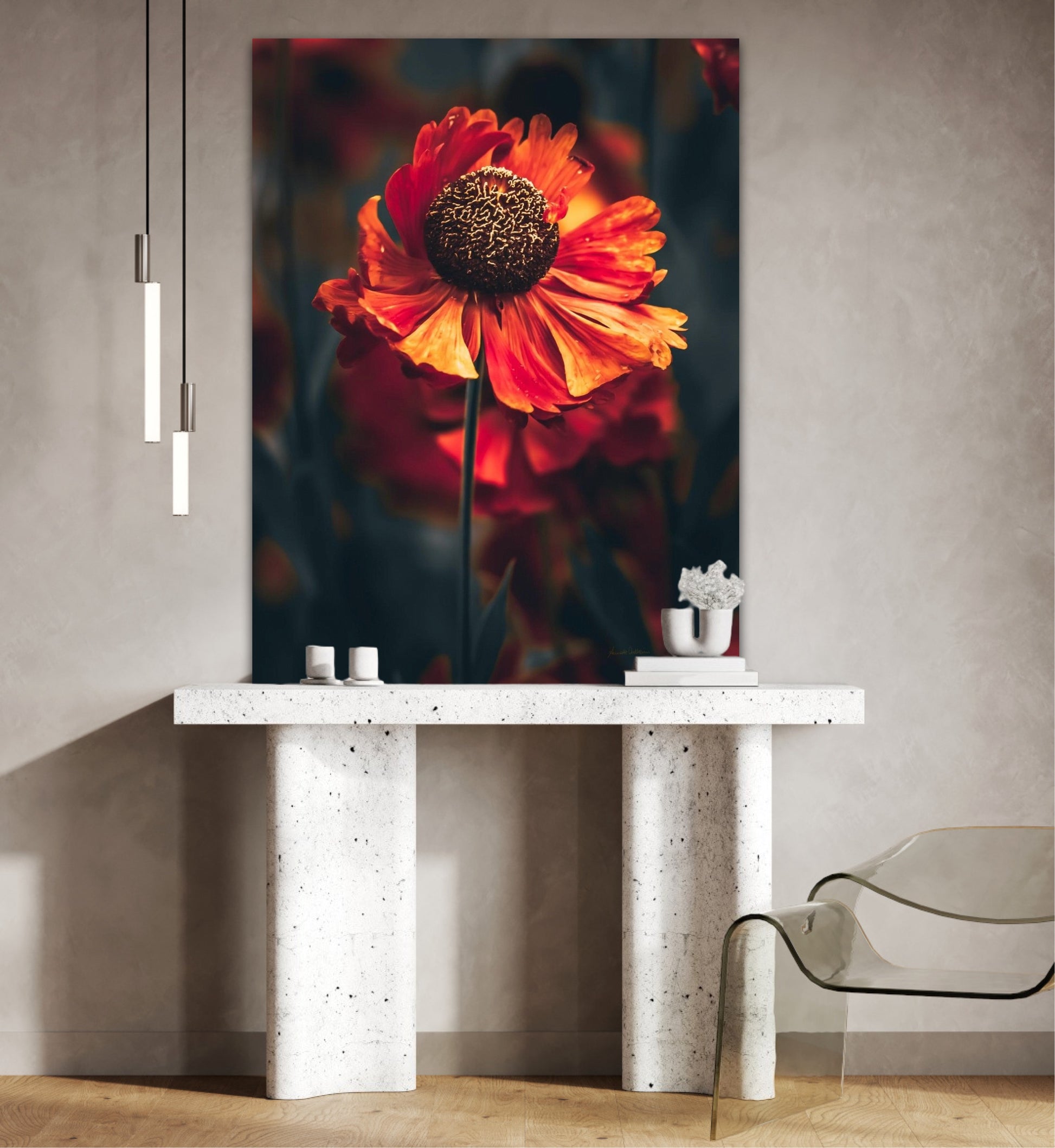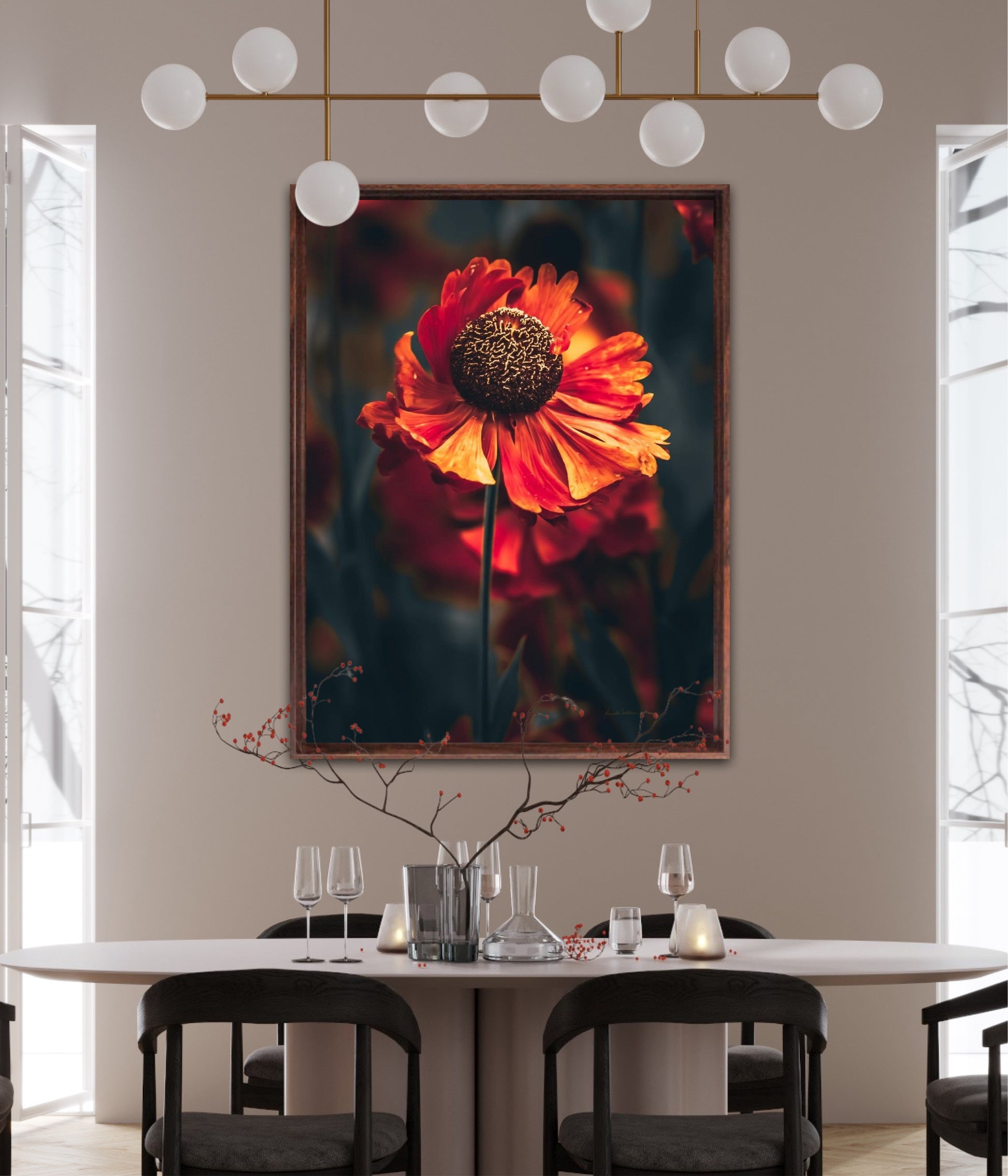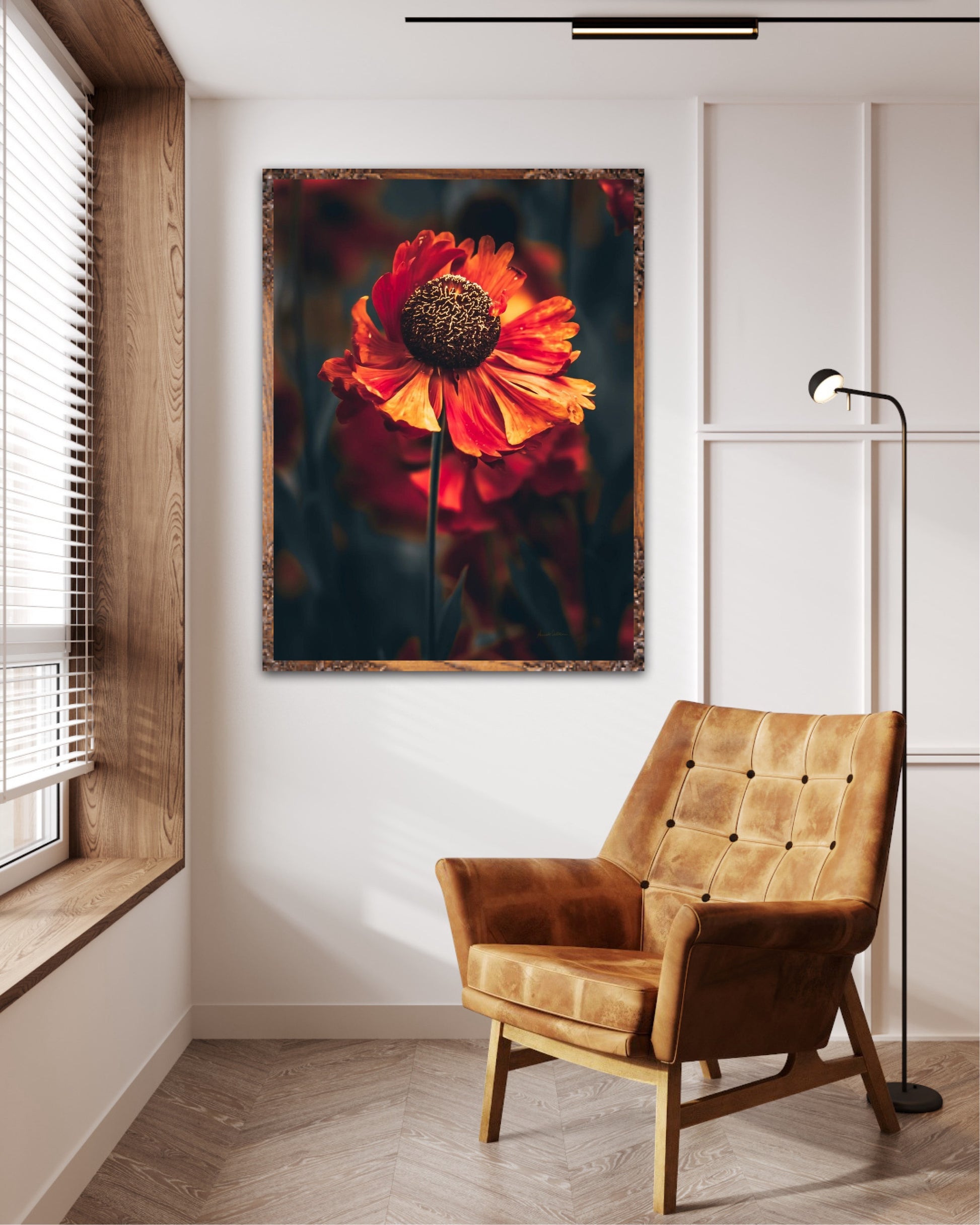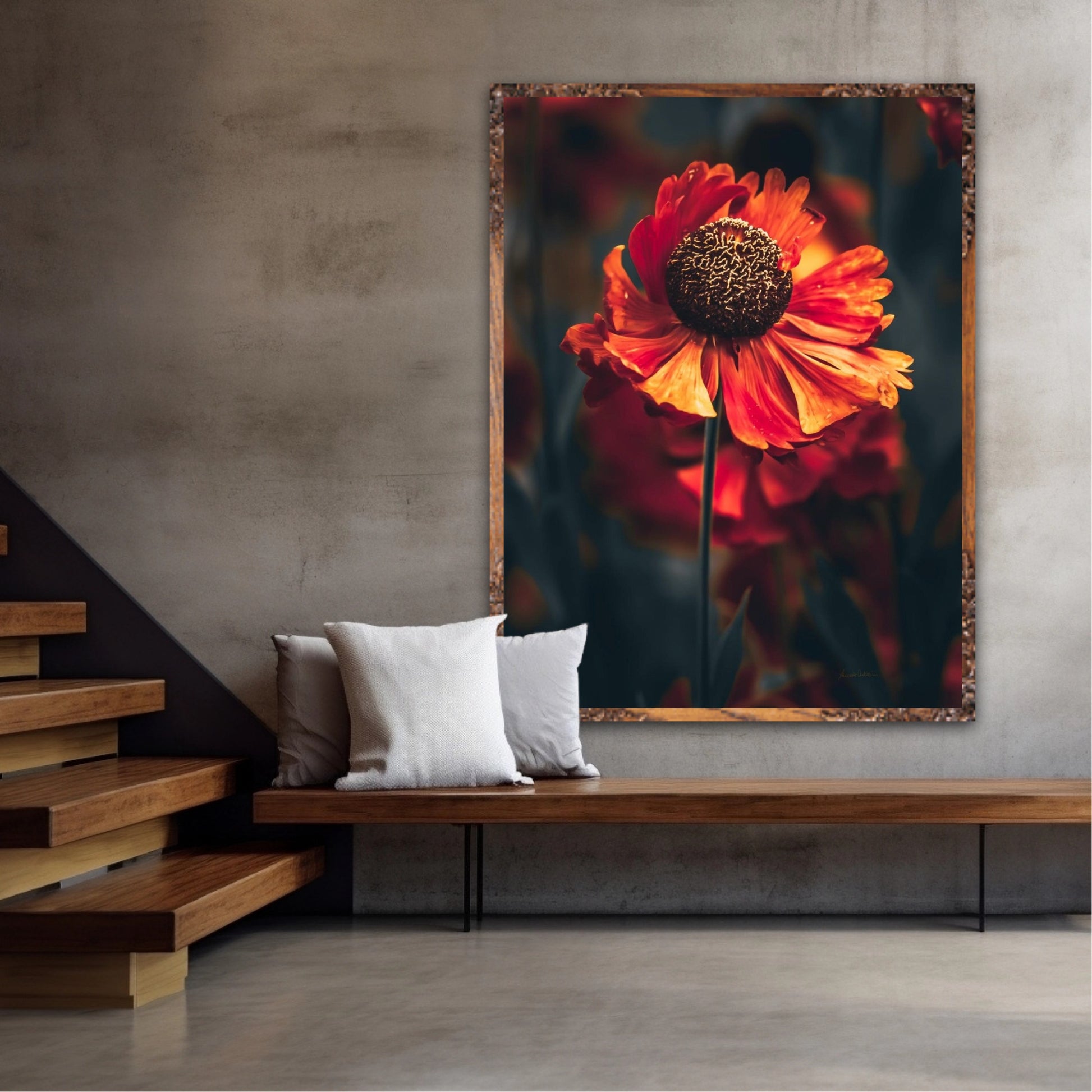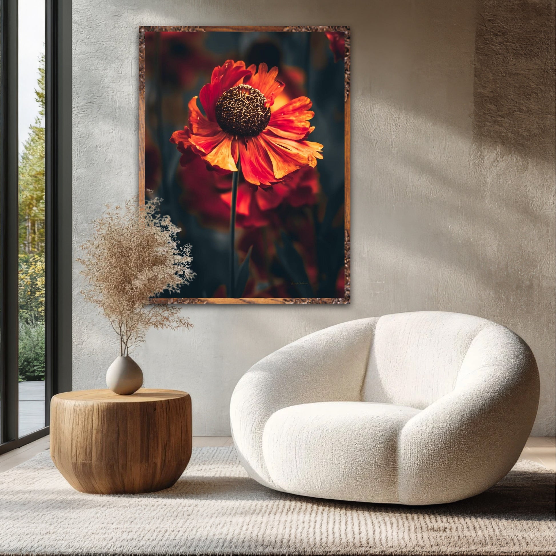 Beautiful photographic wall art of a gorgeous autumn solstice flower on a dark bluegrey background. This art piece will lift you up.