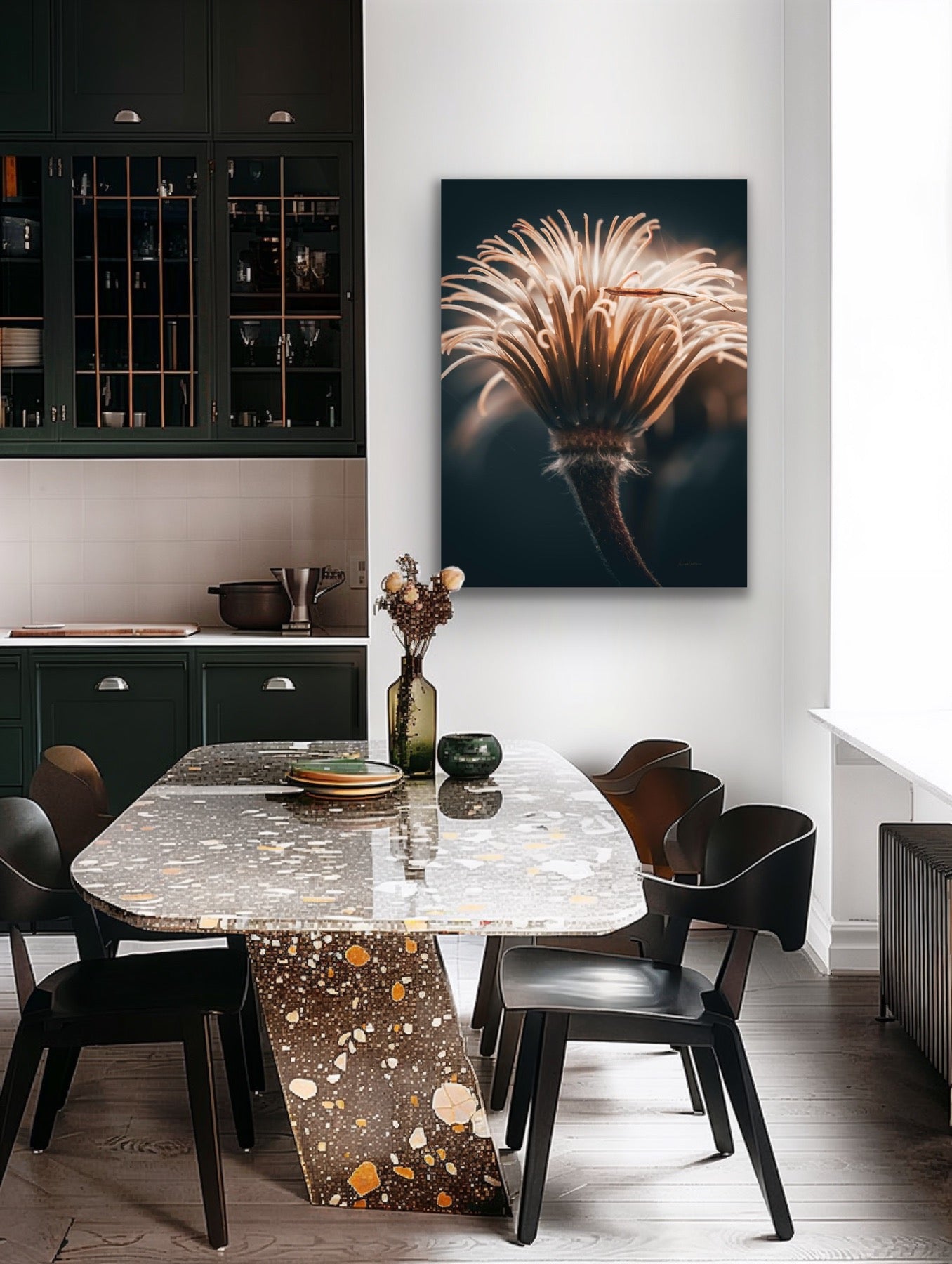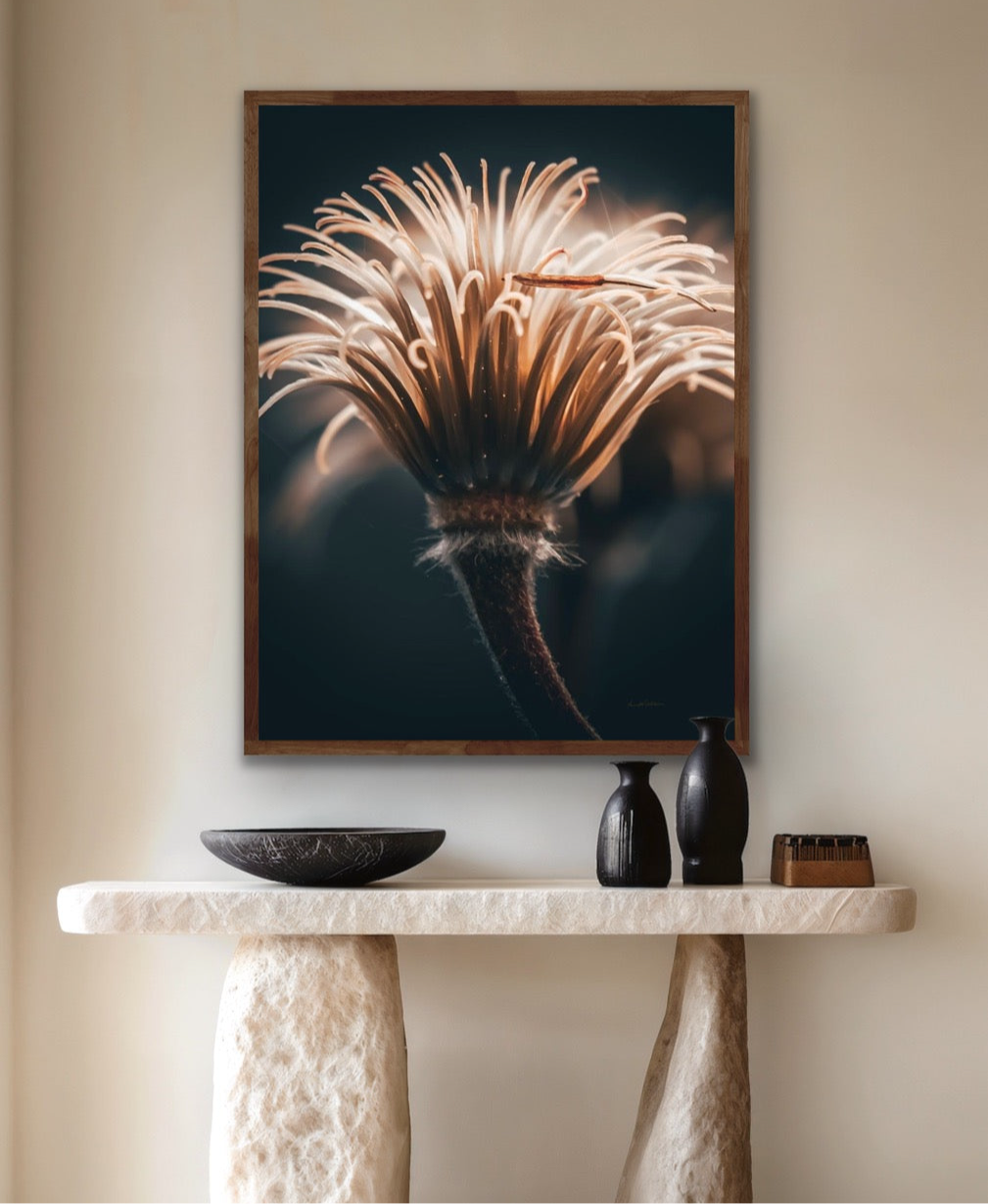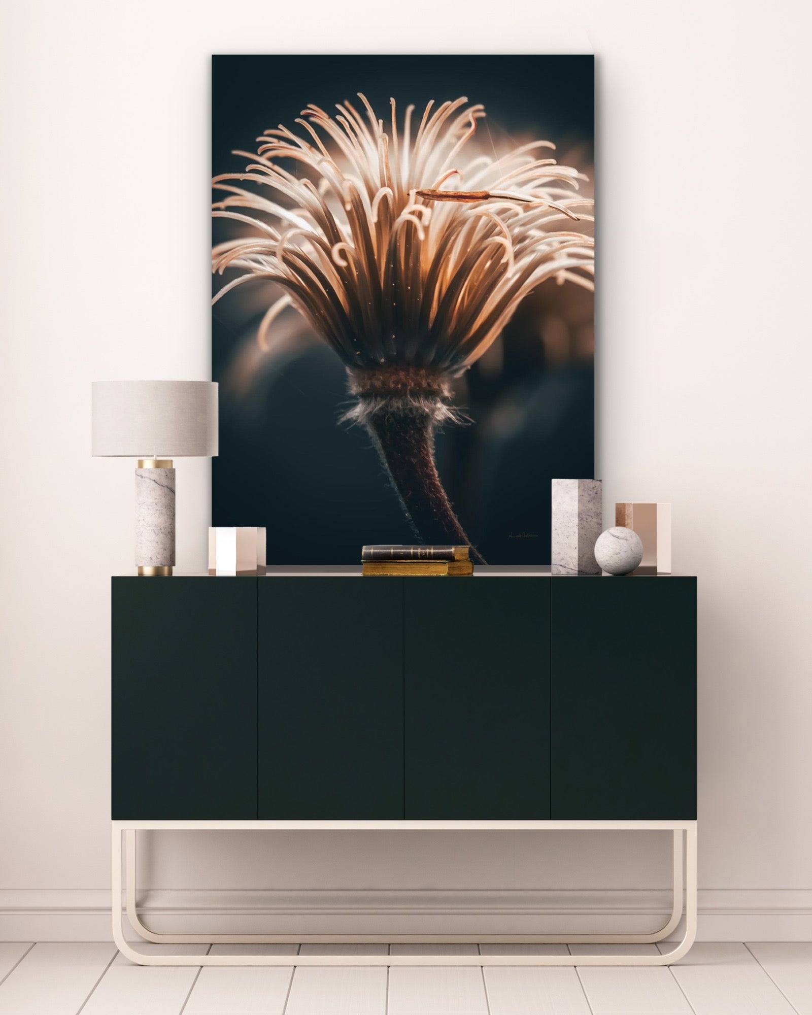 Beautiful photographic wall art of a Clematis 'Jackmanii' seeds in white, brown and dark brown black tones. This is an eye-catcher and an exciting motif that will lift your interior to new heights.