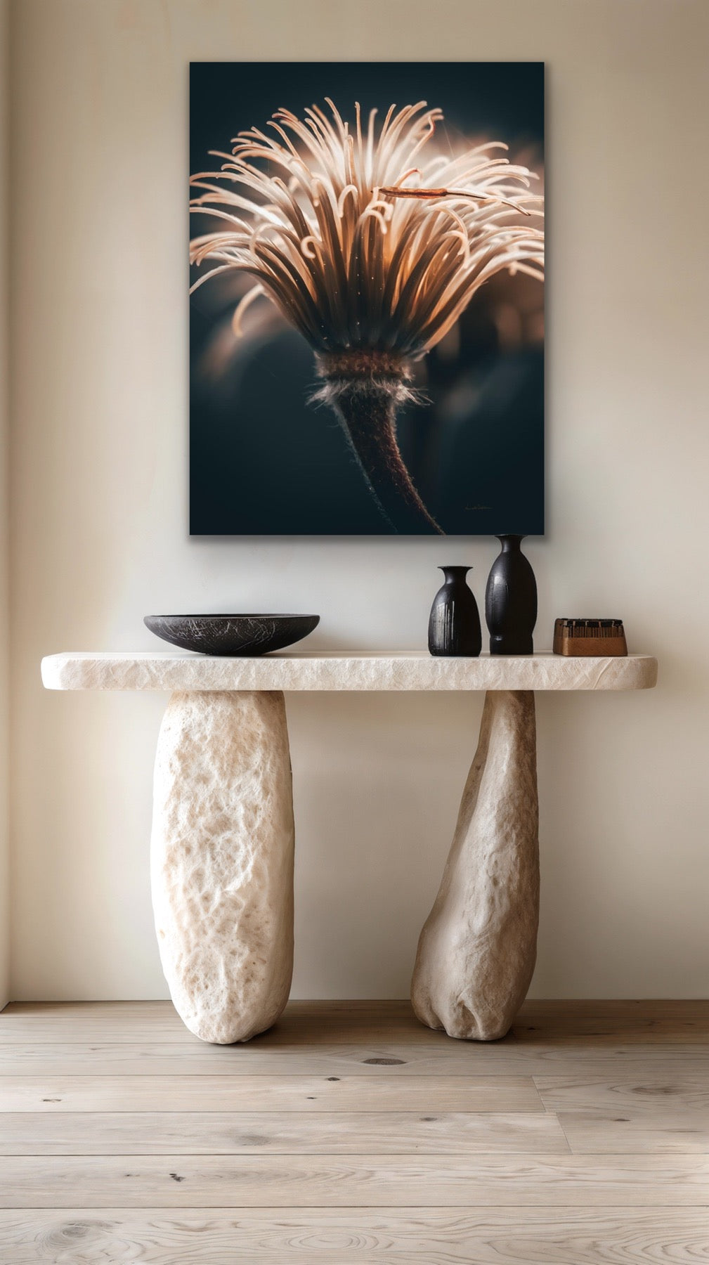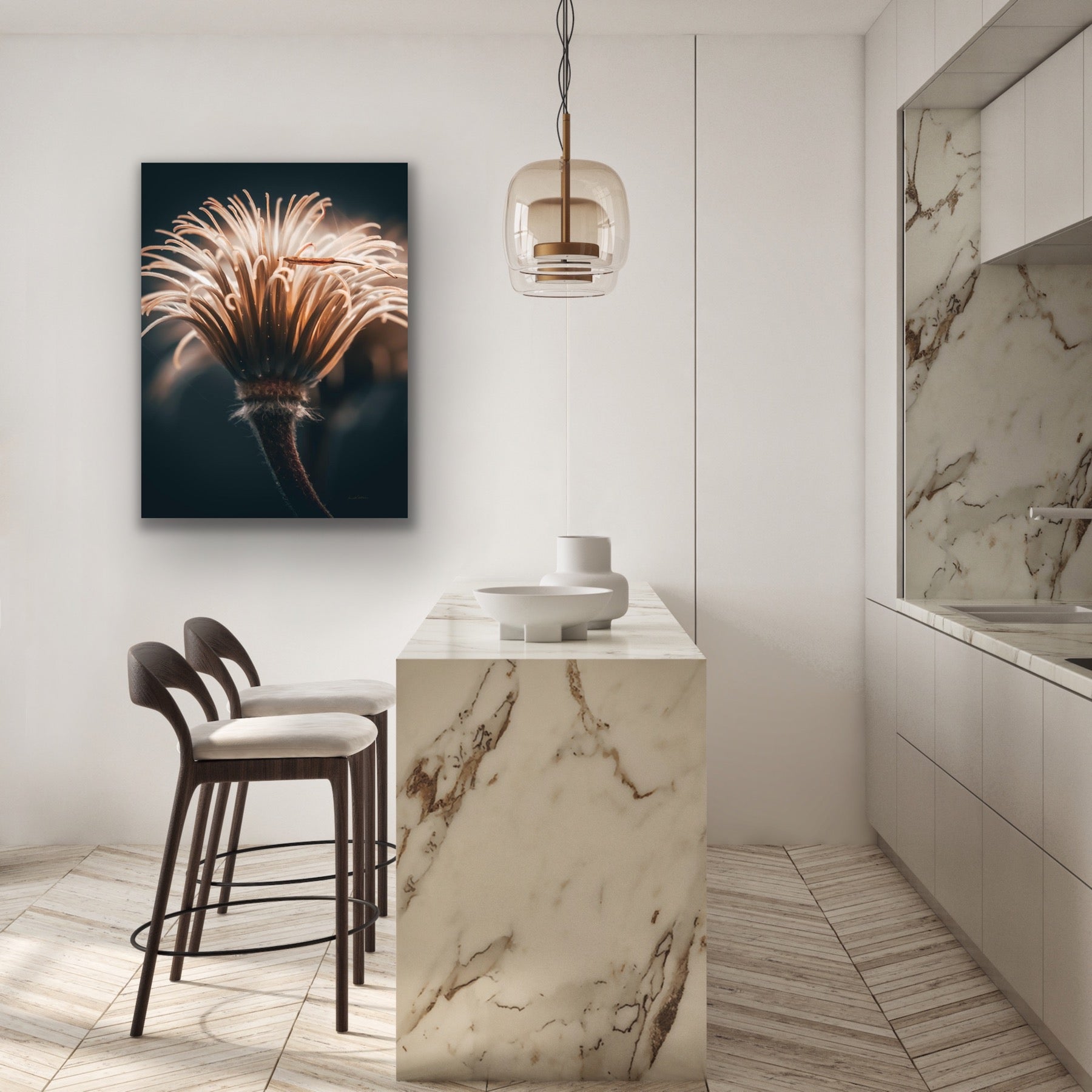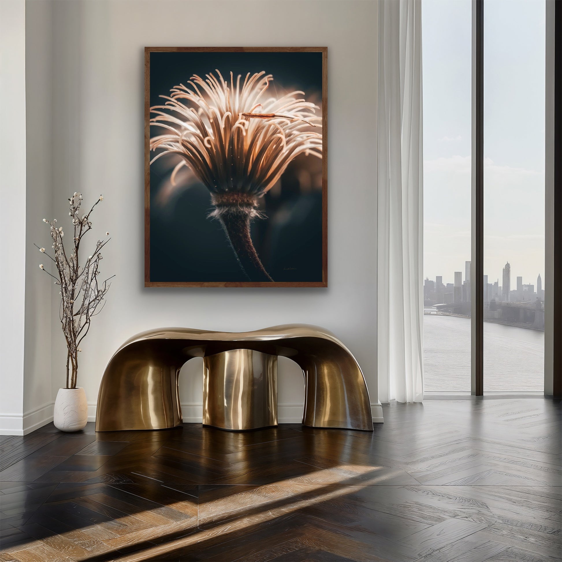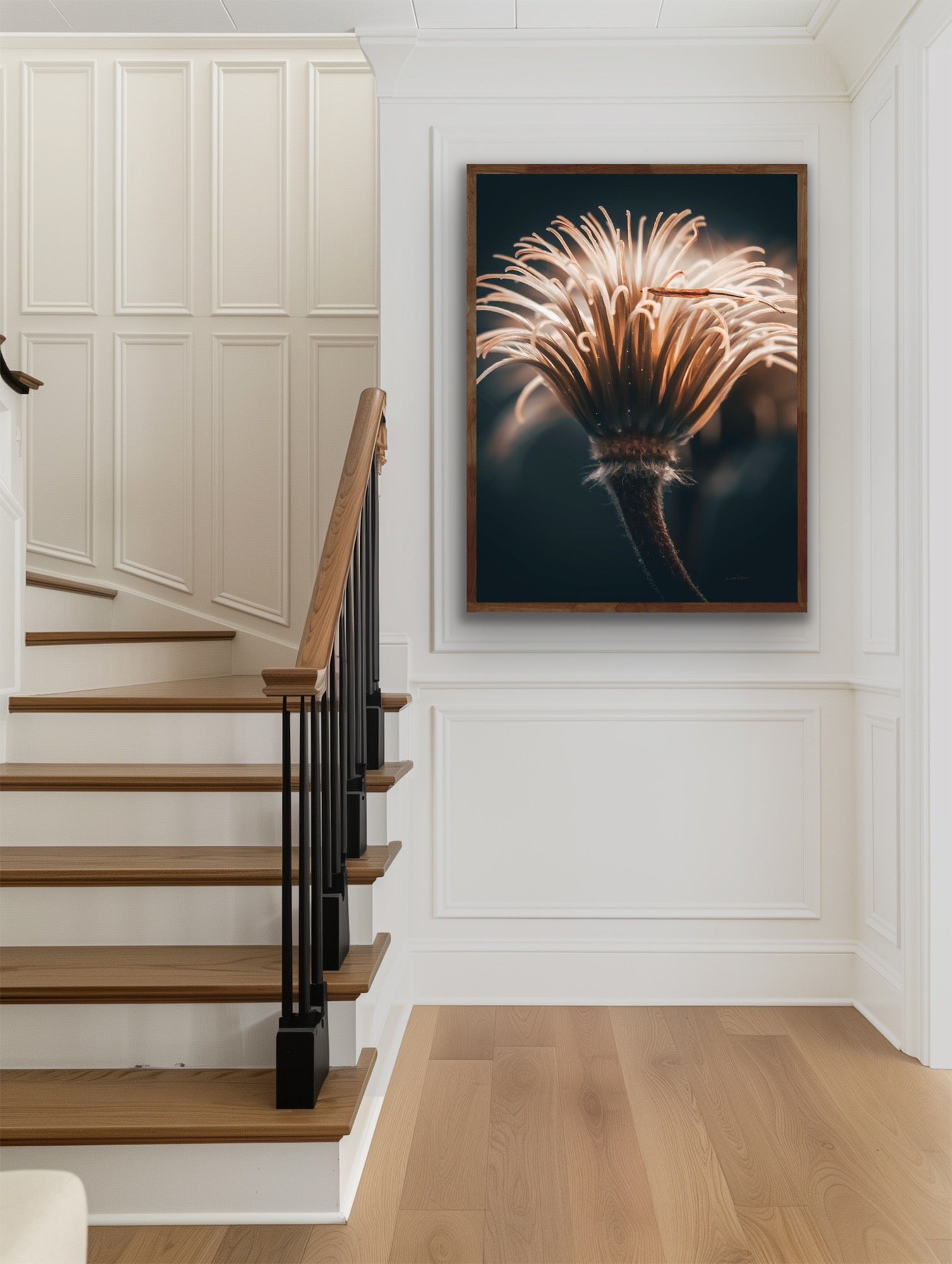 Beautiful photographic wall art of a Clematis 'Jackmanii' seeds in white, brown and dark brown black tones. This is an eye-catcher and an exciting motif that will lift your interior to new heights.
