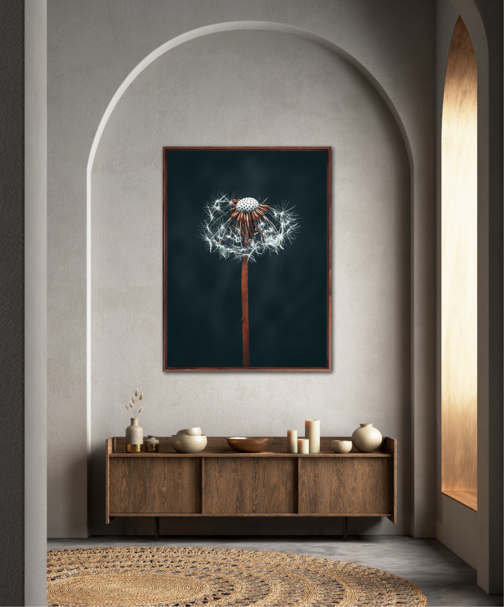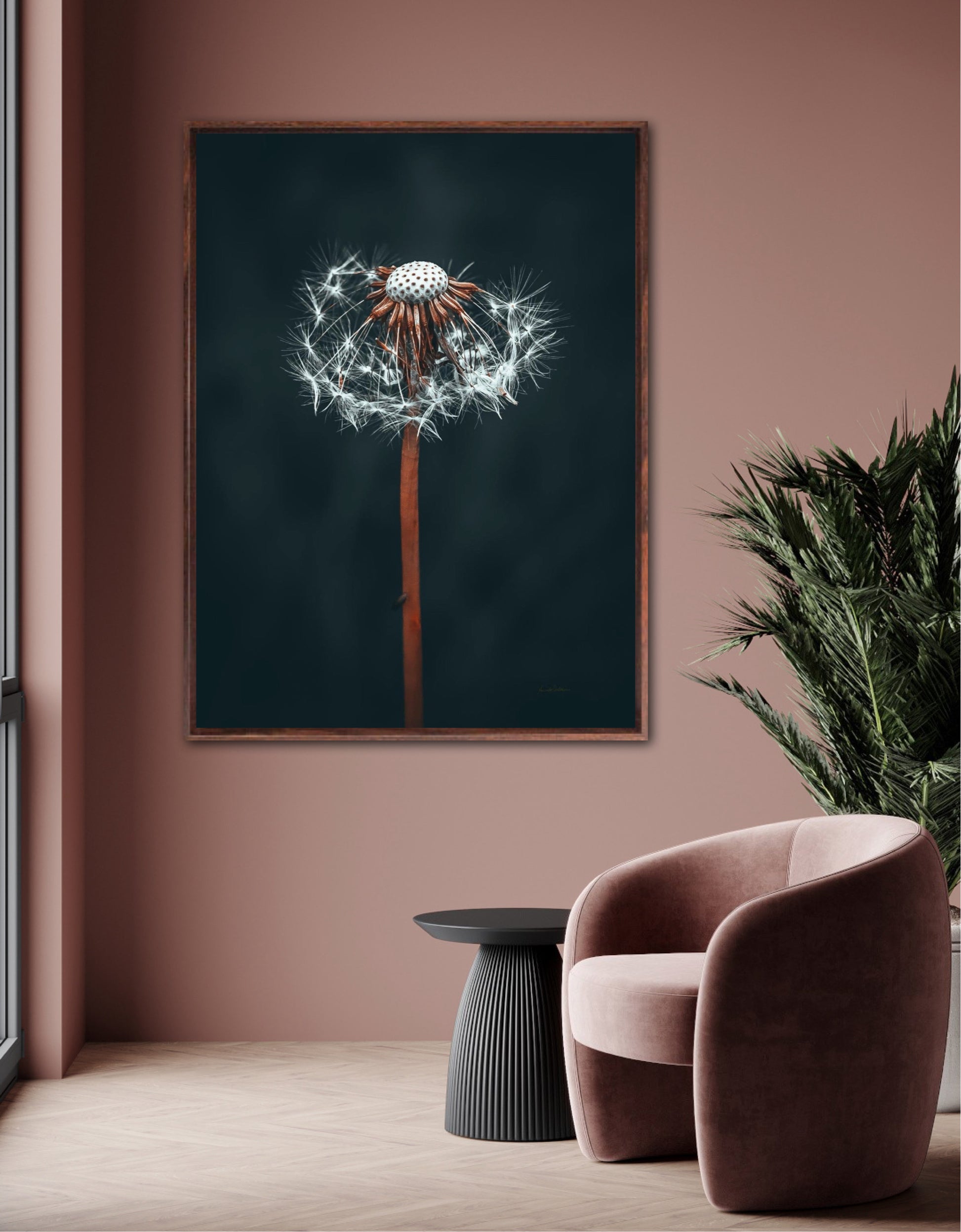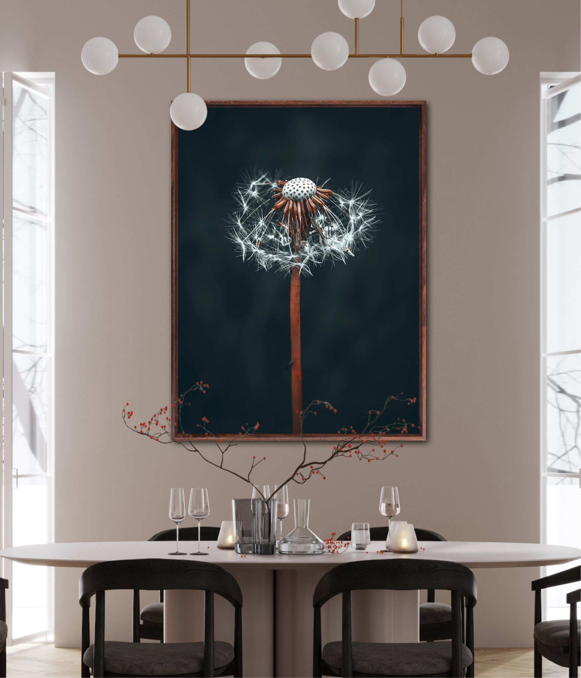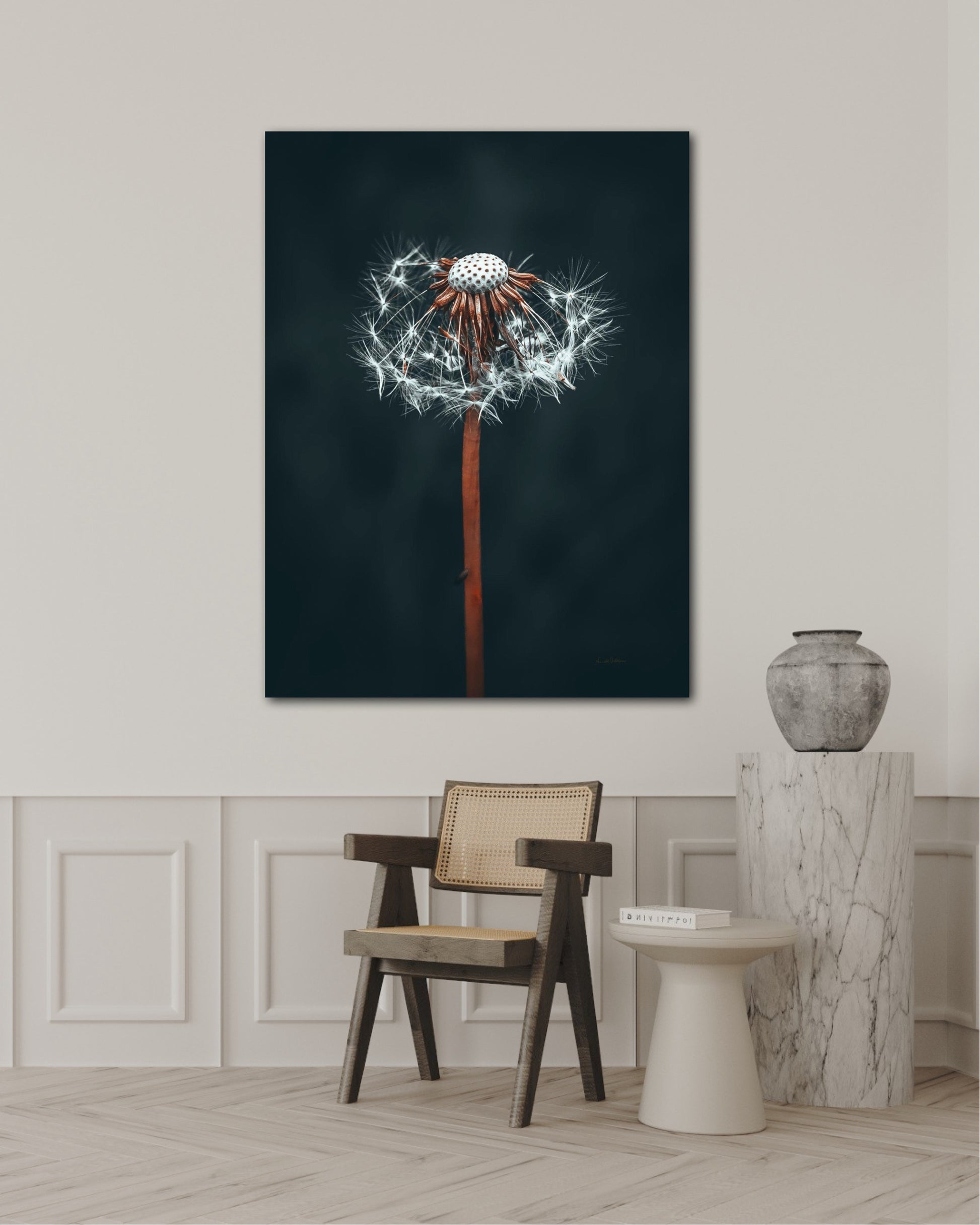 Beautiful photographic wall art of a dandelion with half the seeds, still on display and looking proud. Great dark mood and rust colour together with the whites.