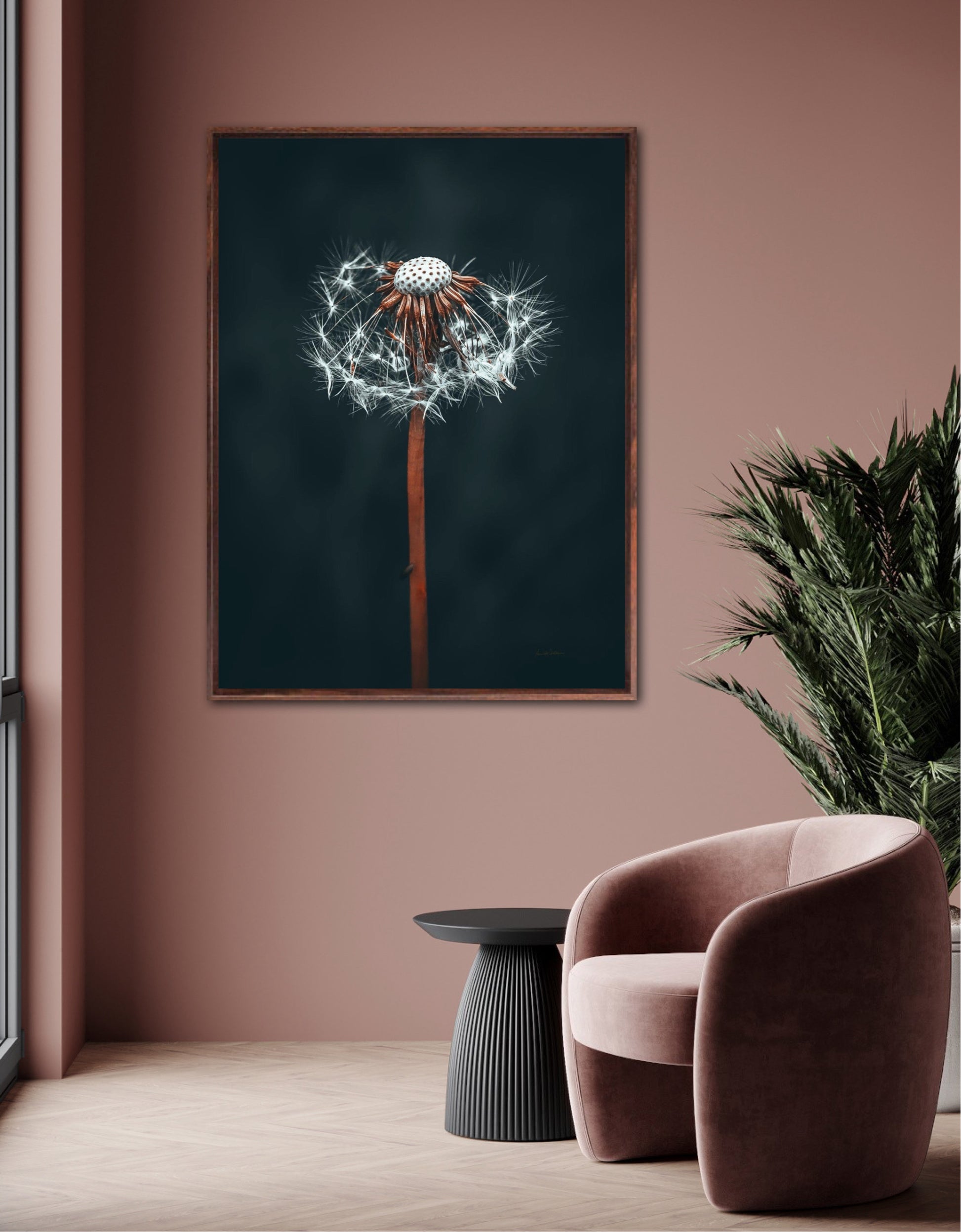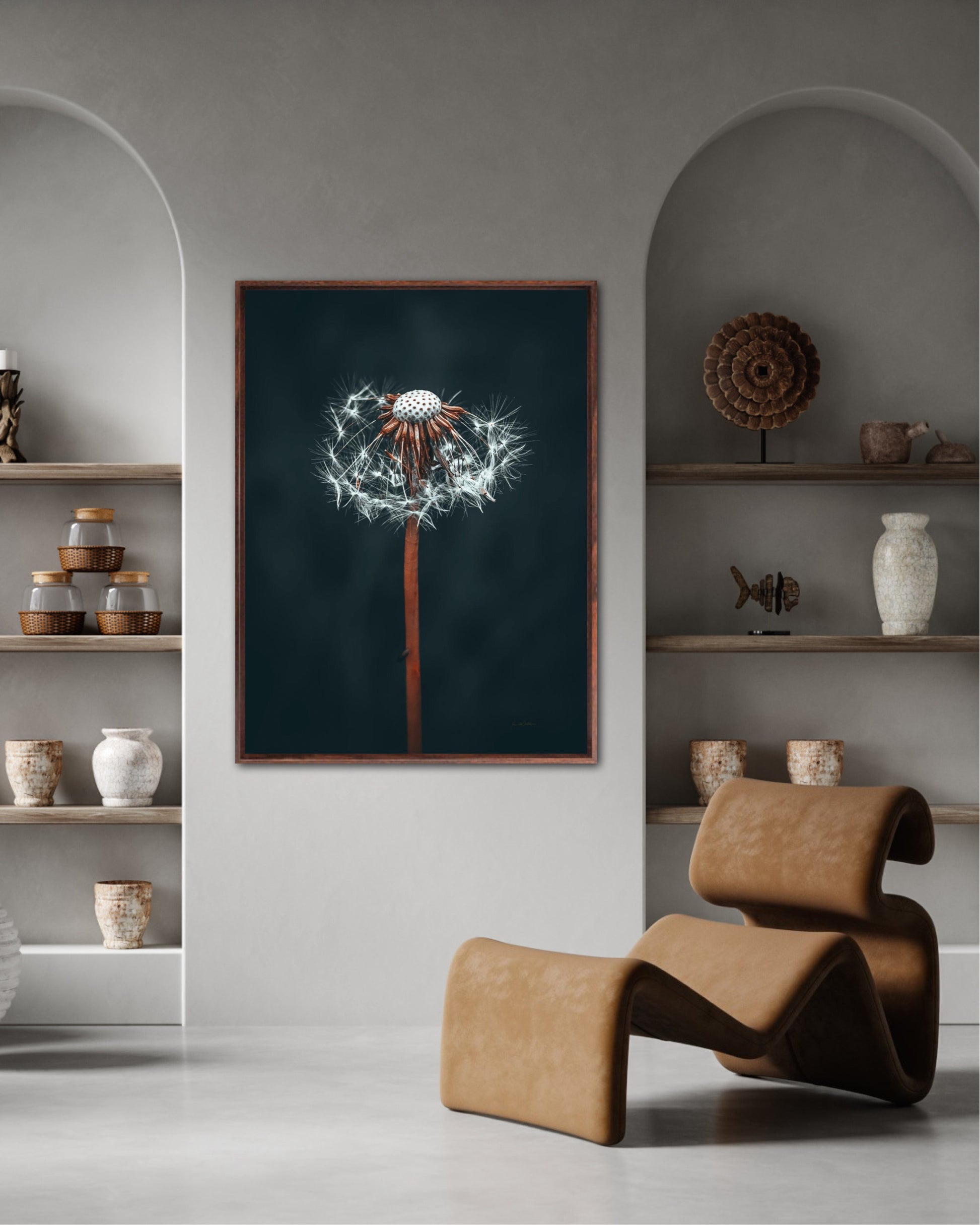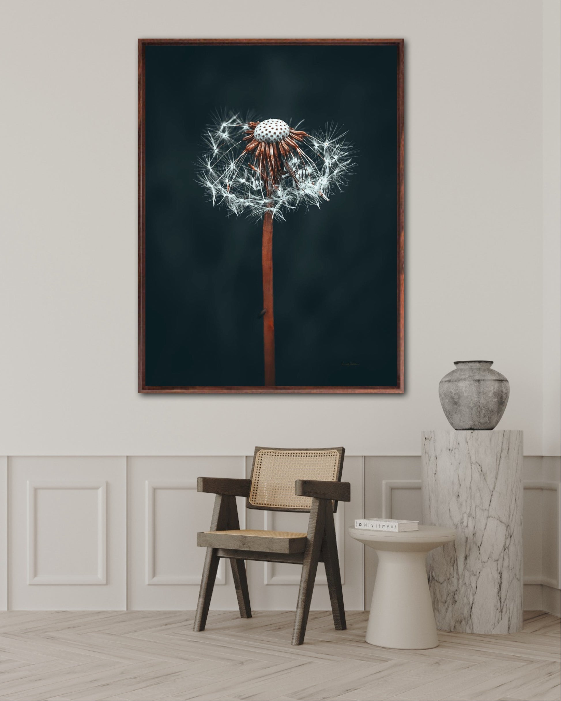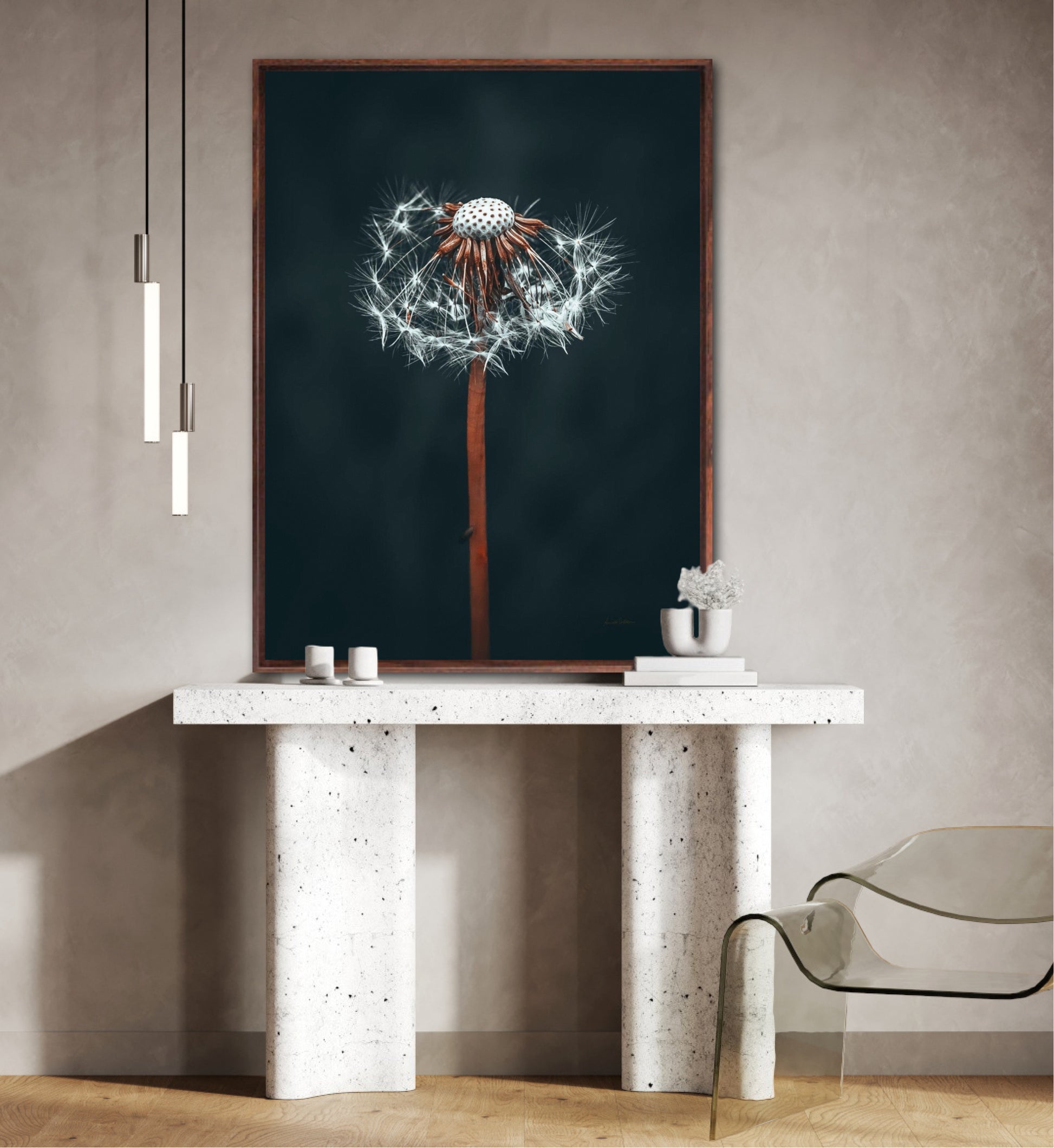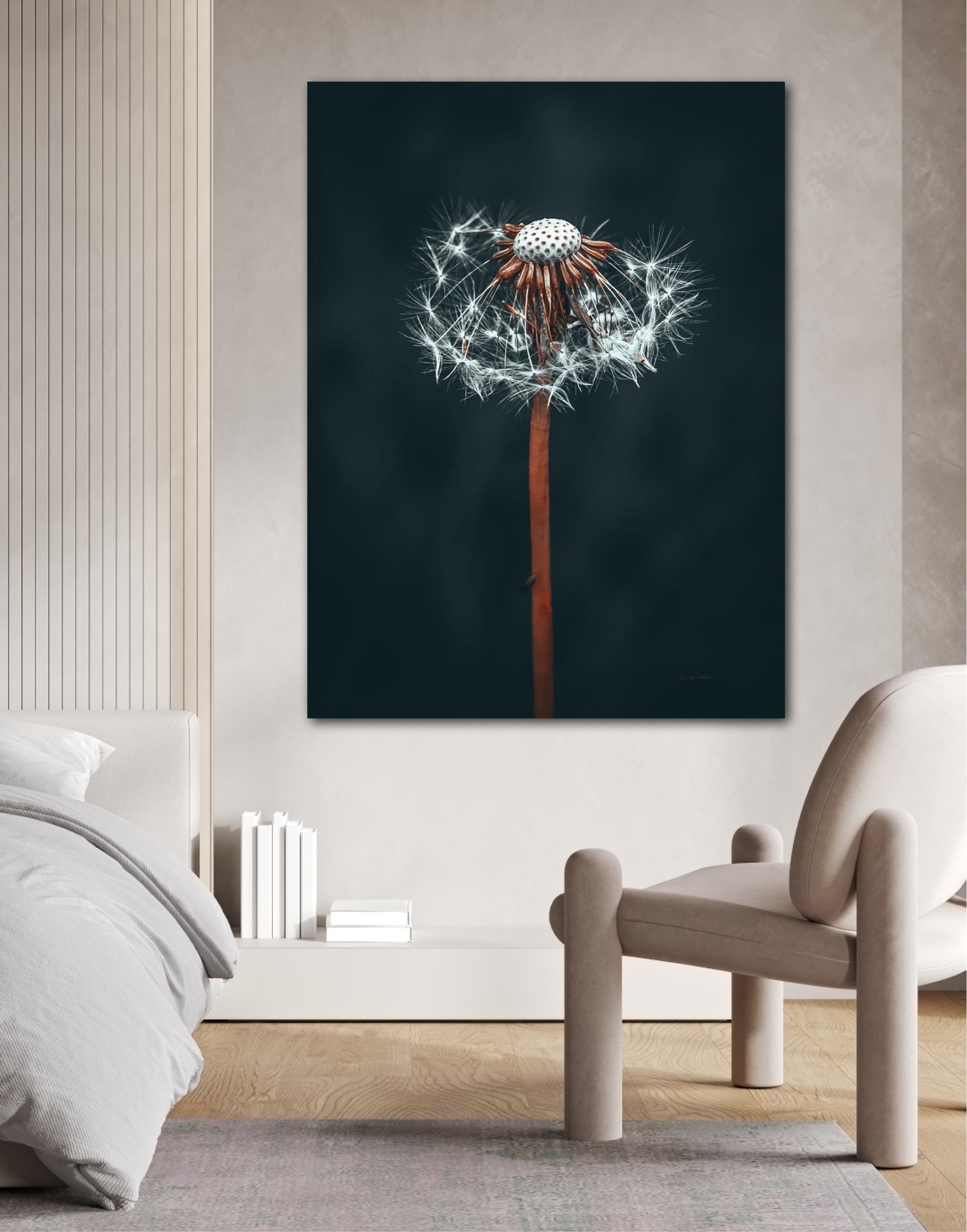 Beautiful photographic wall art of a dandelion with half the seeds, still on display and looking proud. Great dark mood and rust colour together with the whites.