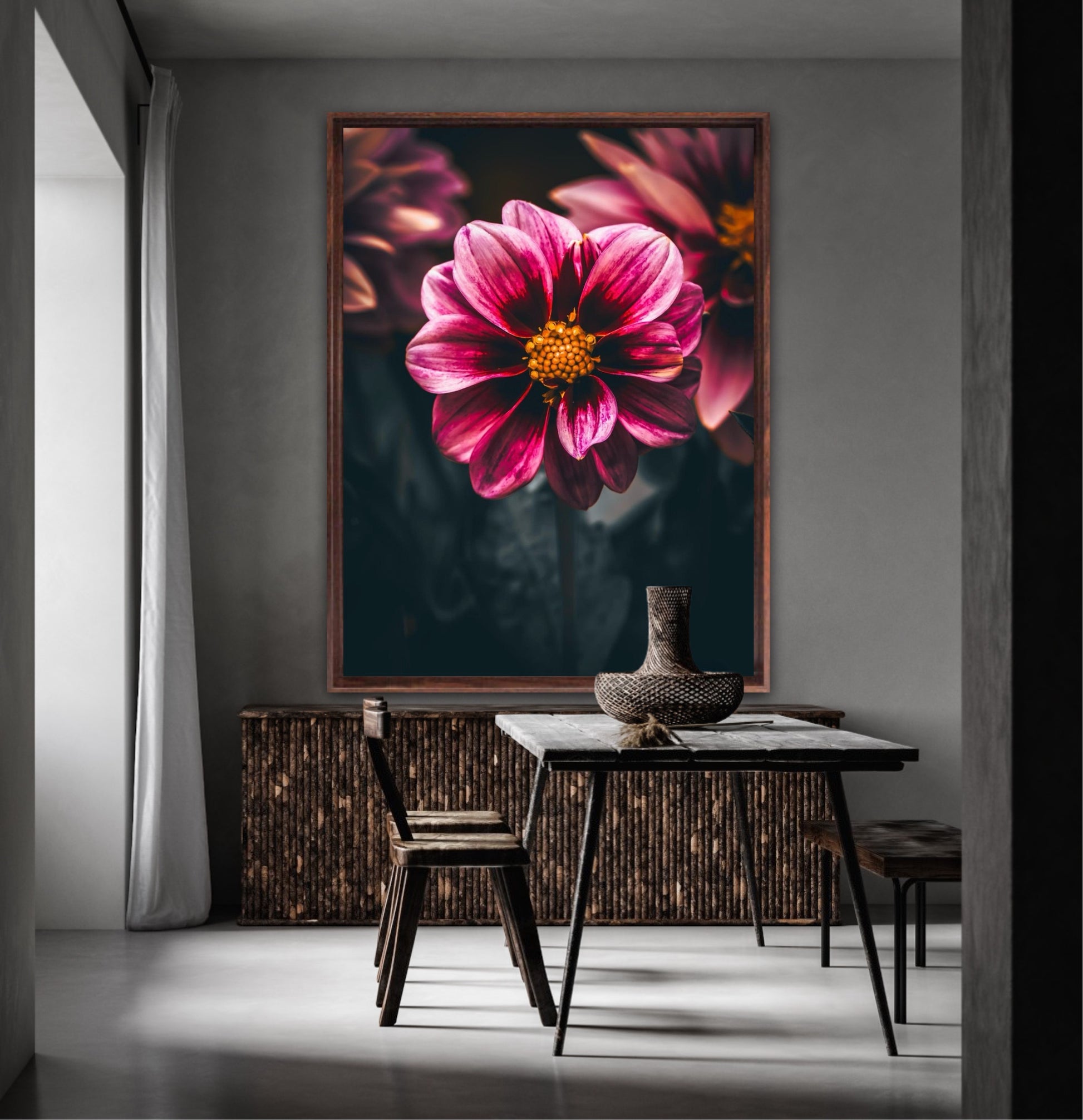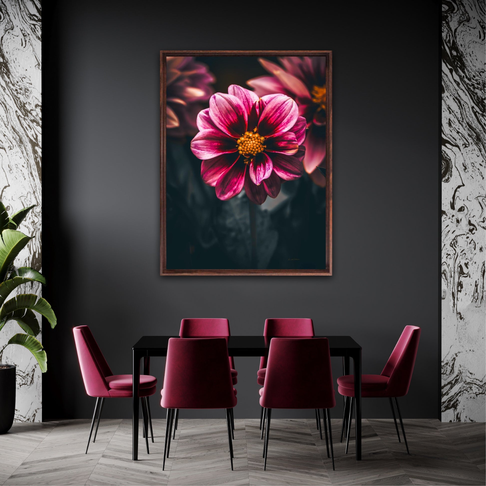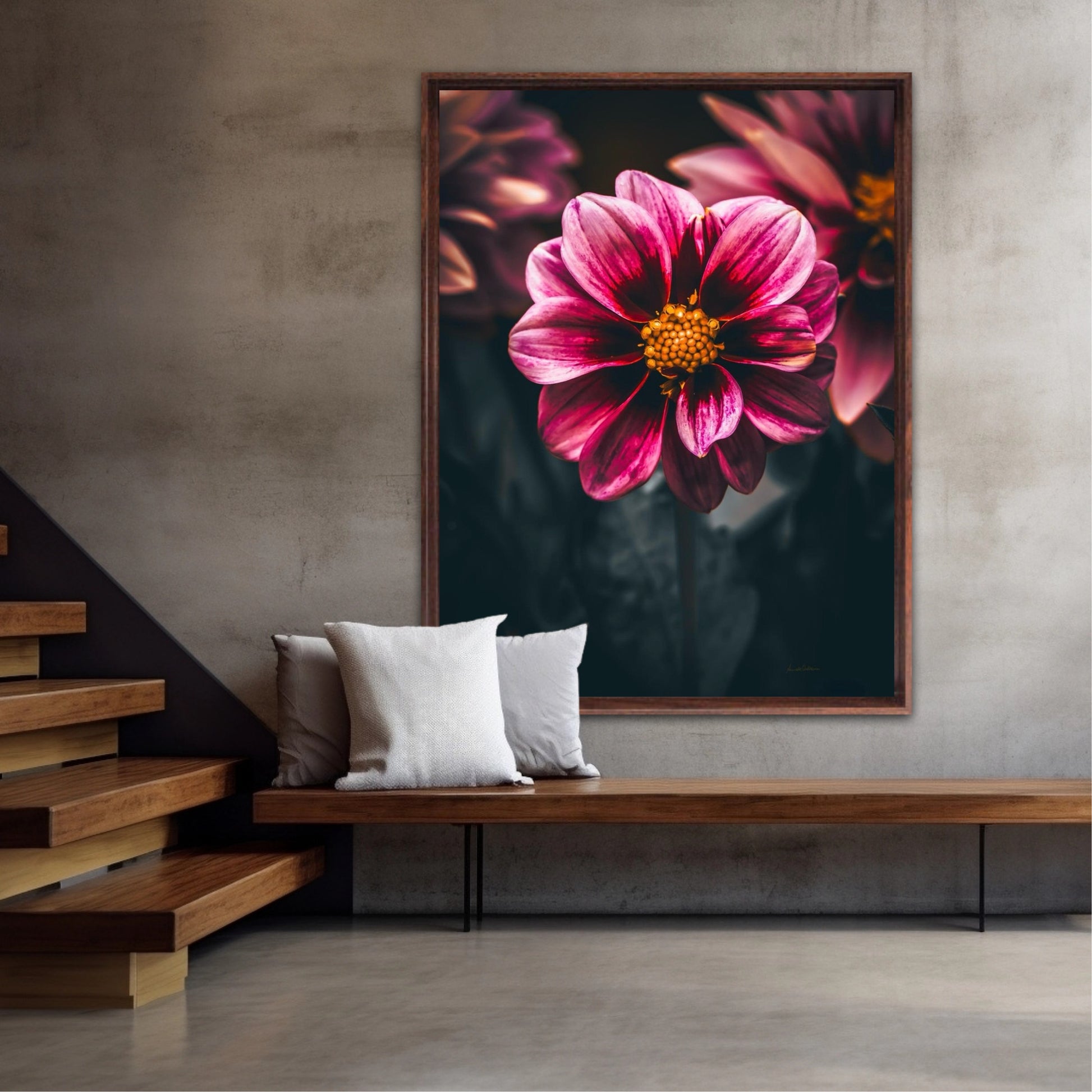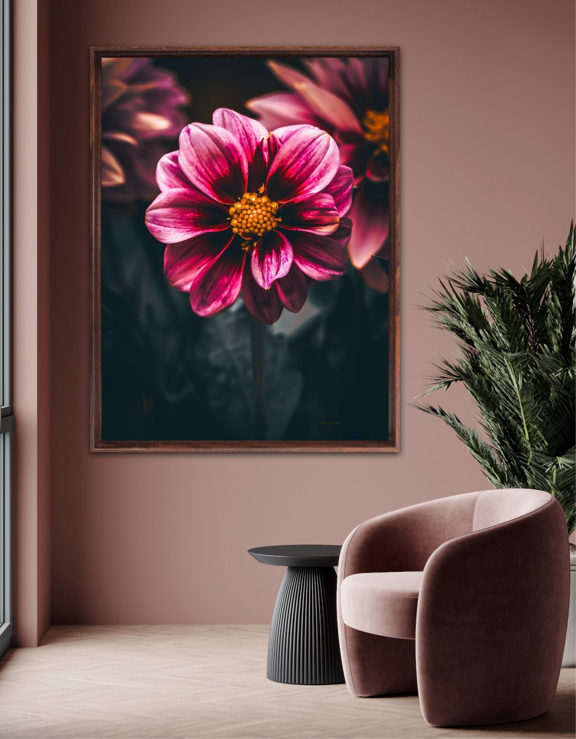 Striking photographic wall art of a Dahlia flower close up in stunning pink tones, on a dark background. This artwork will be a stand-out piece in your home and bring you peace and tranquility.