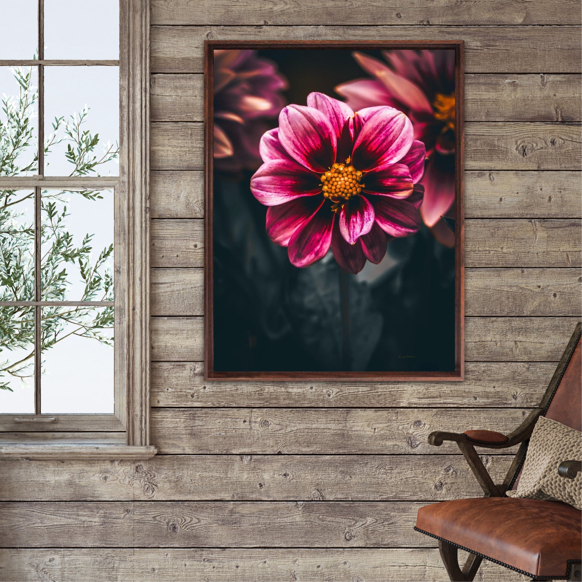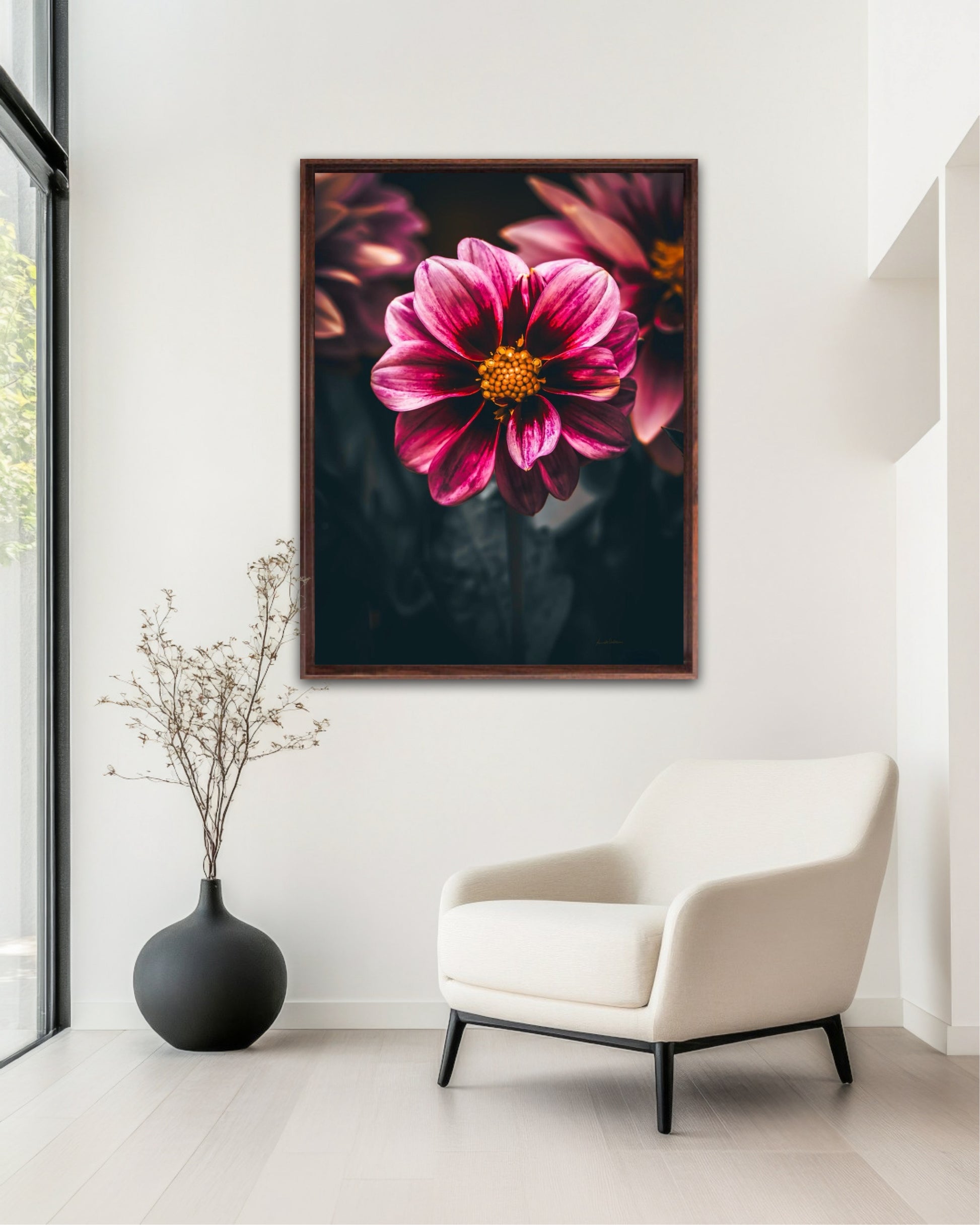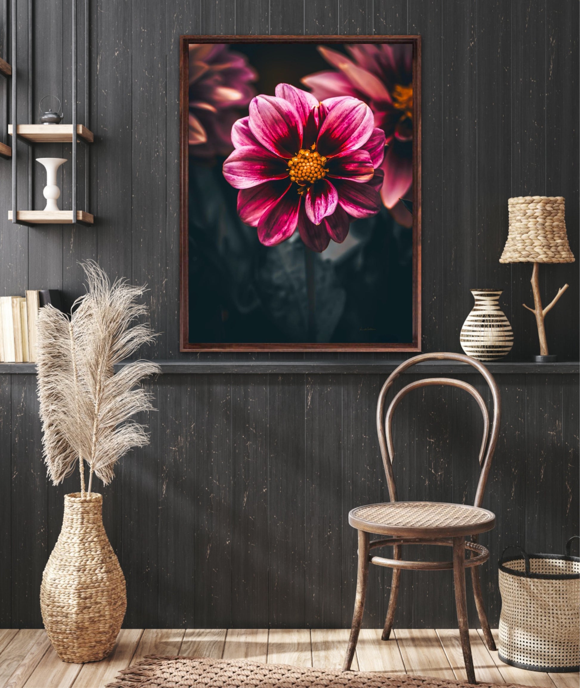 Striking photographic wall art of a Dahlia flower close up in stunning pink tones, on a dark background. This artwork will be a stand-out piece in your home and bring you peace and tranquility.