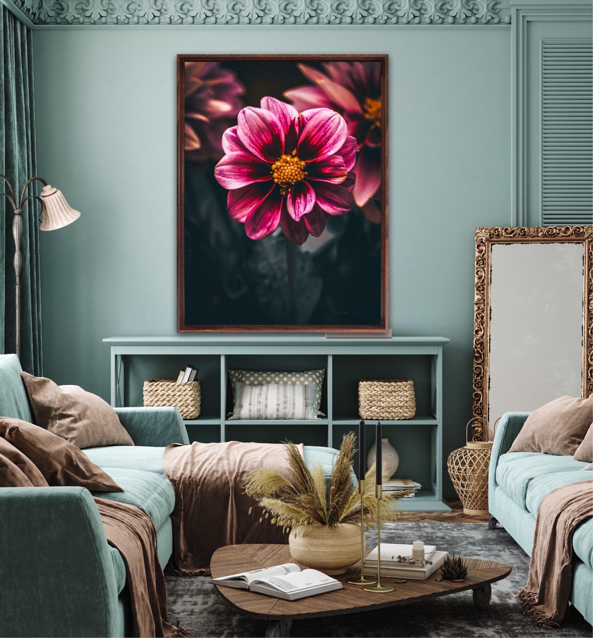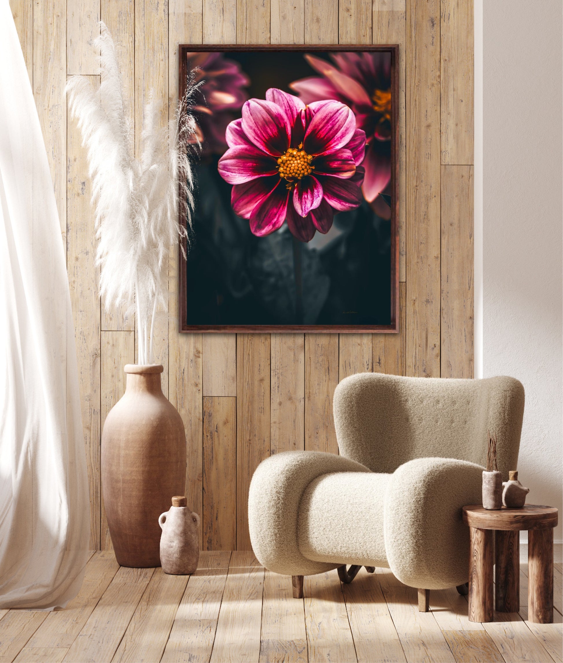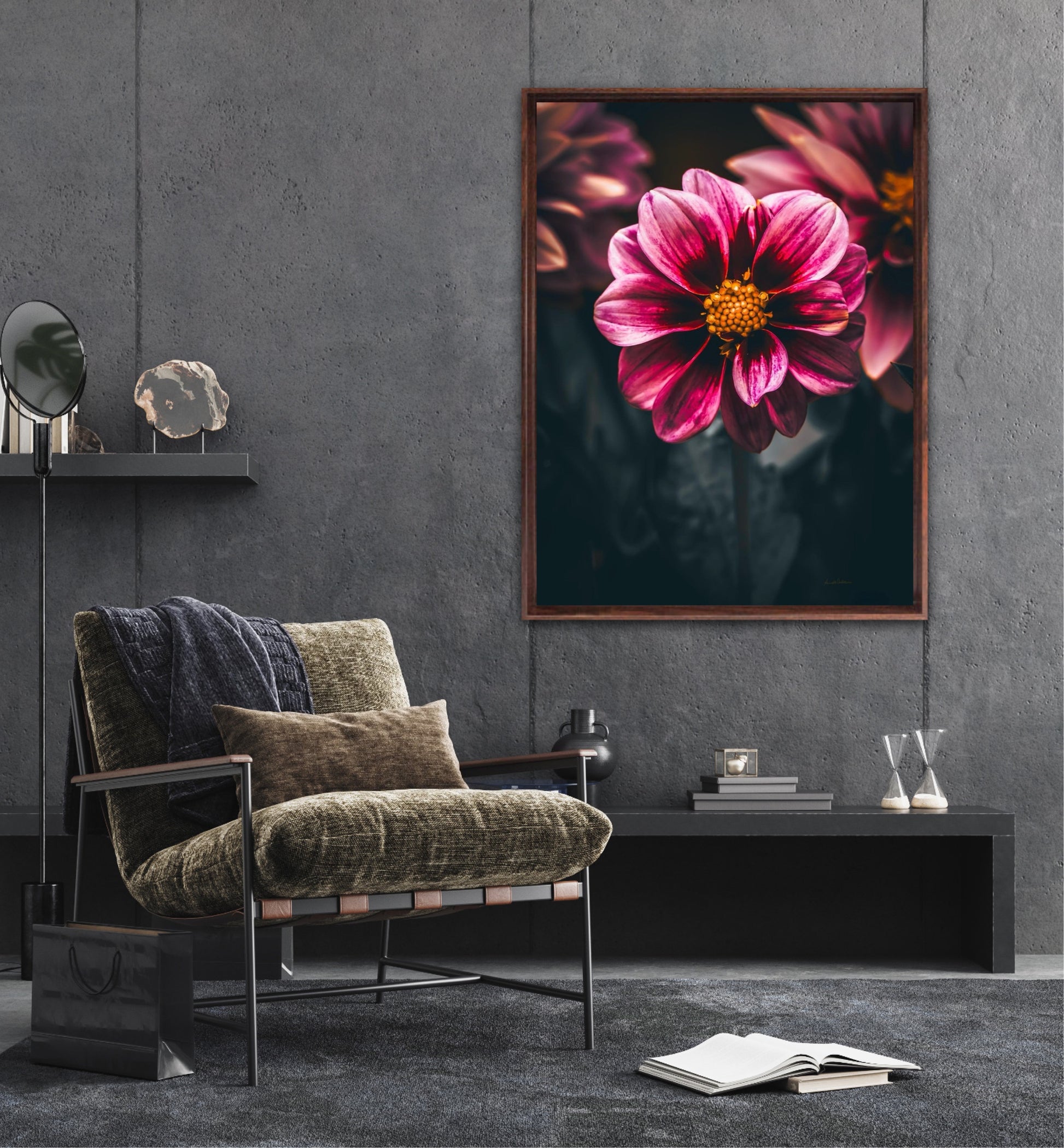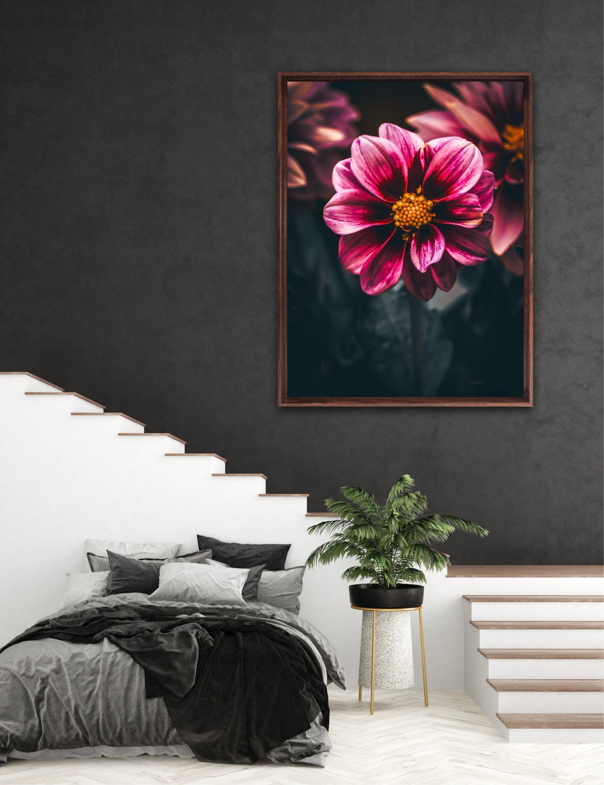 Striking photographic wall art of a Dahlia flower close up in stunning pink tones, on a dark background. This artwork will be a stand-out piece in your home and bring you peace and tranquility.