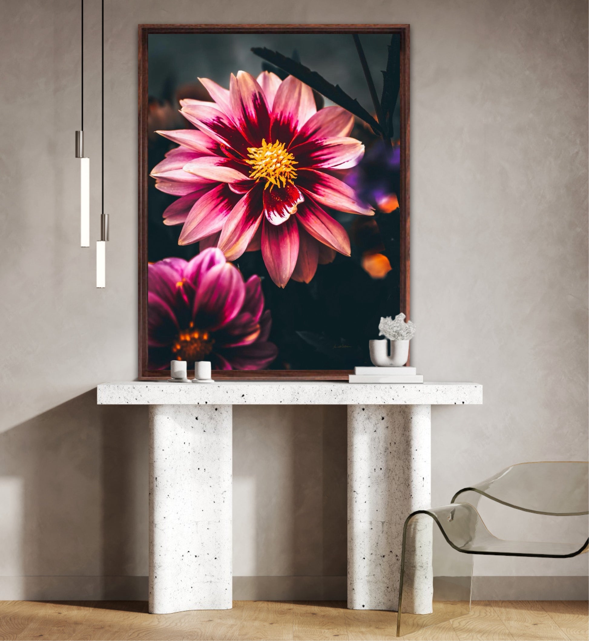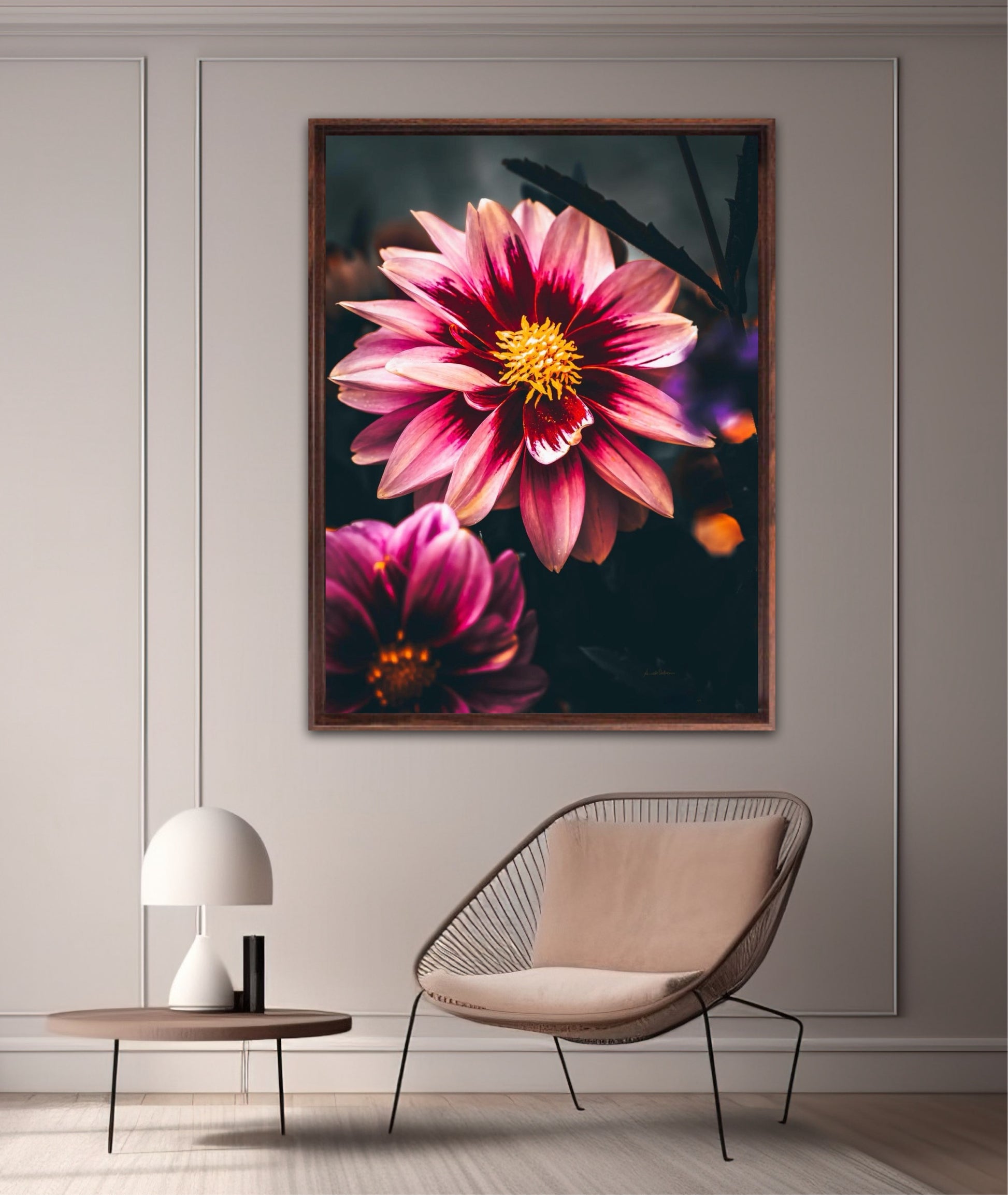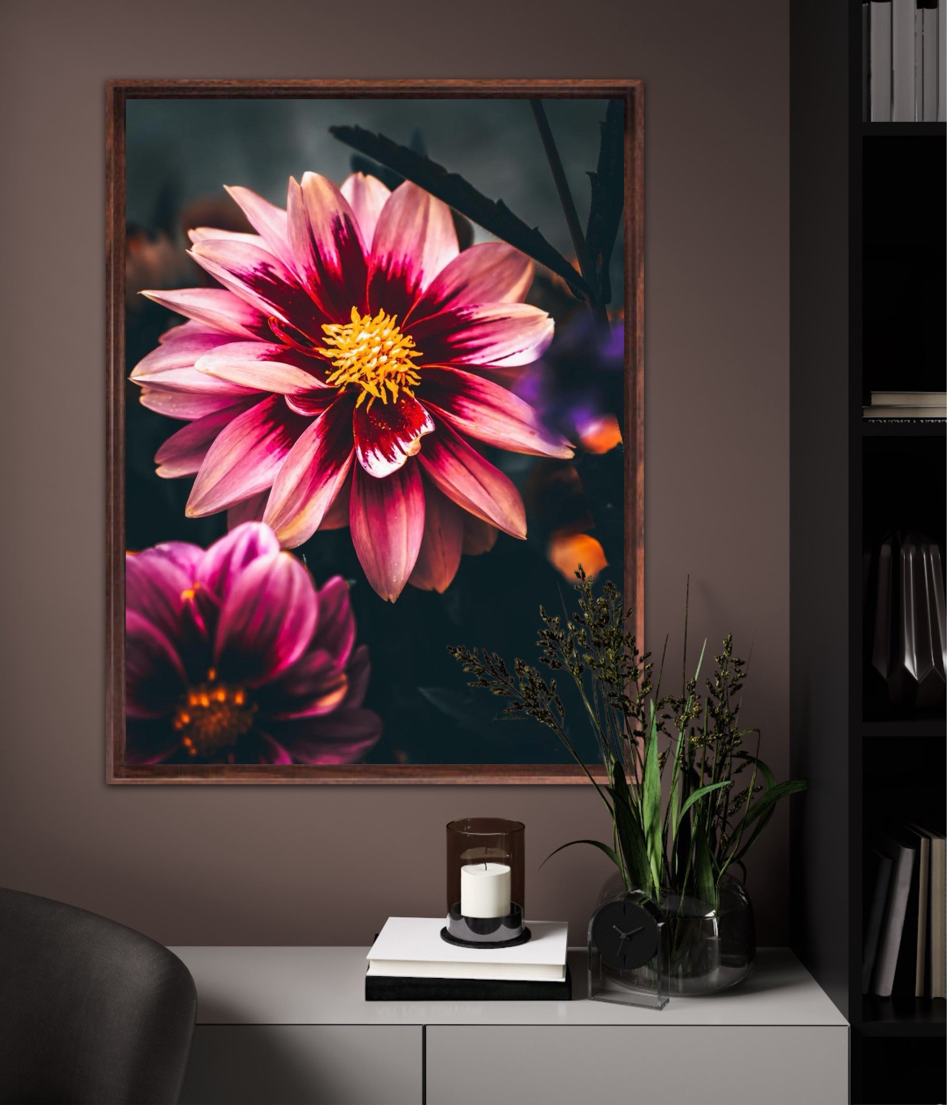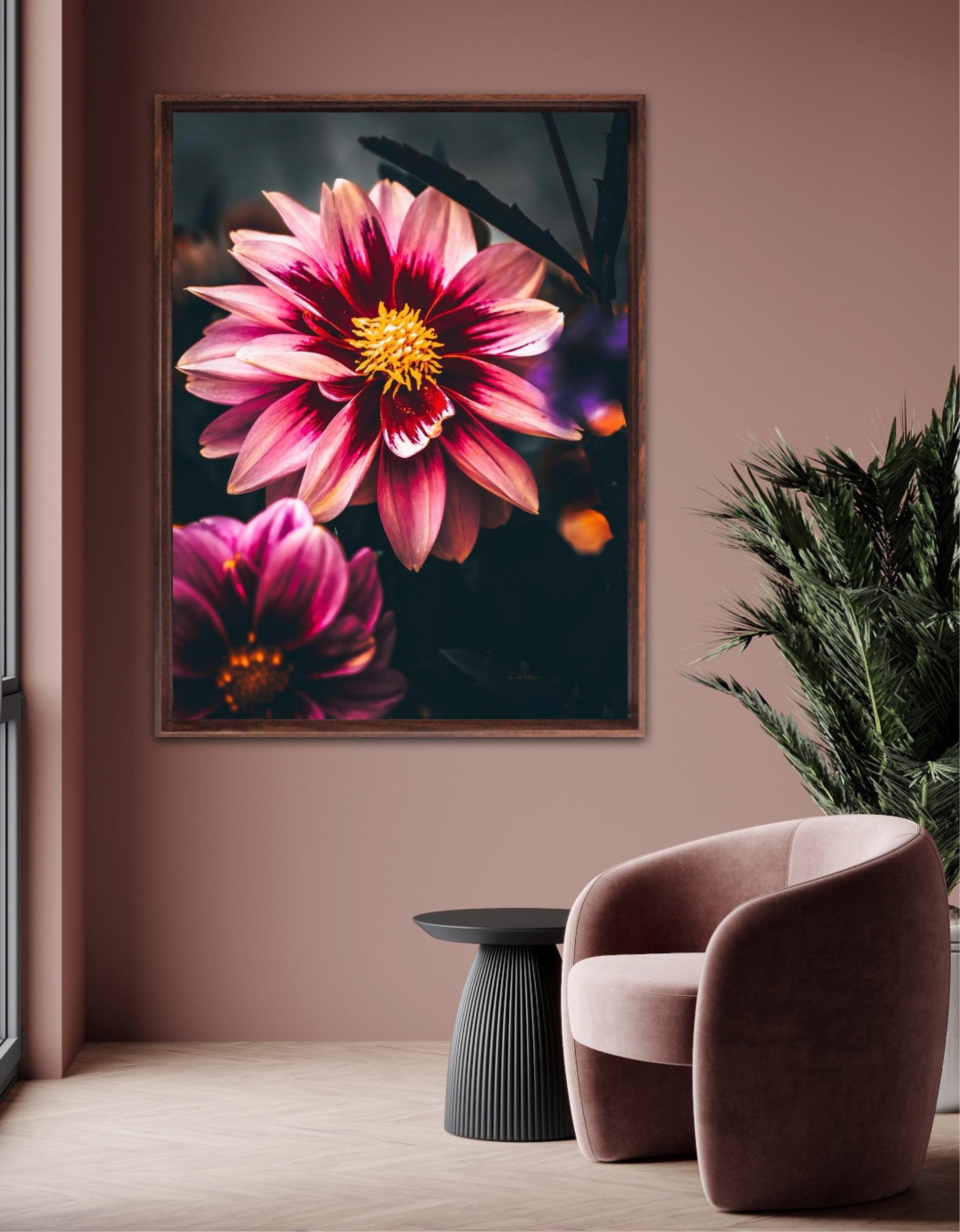 Striking photographic wall art of a Dahlia flower close up in stunning pink tones, on a dark background. This artwork will be a stand-out piece in your home and bring you peace and tranquility.
