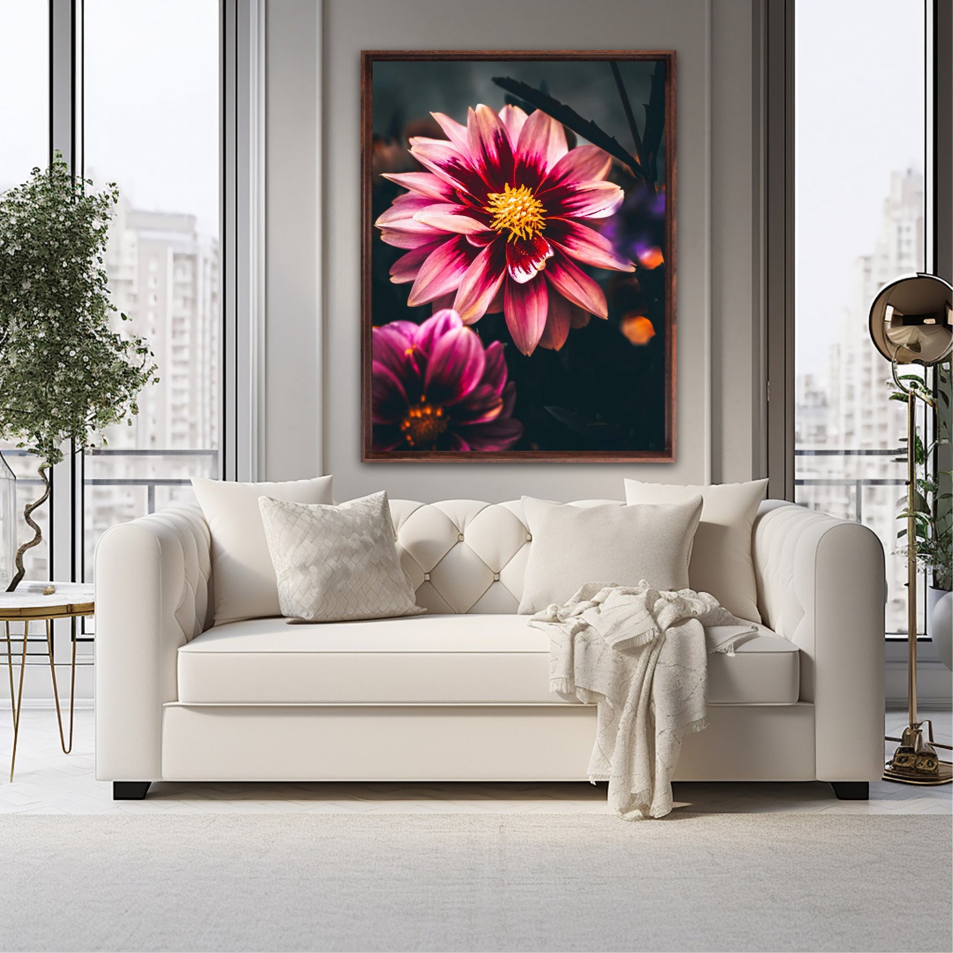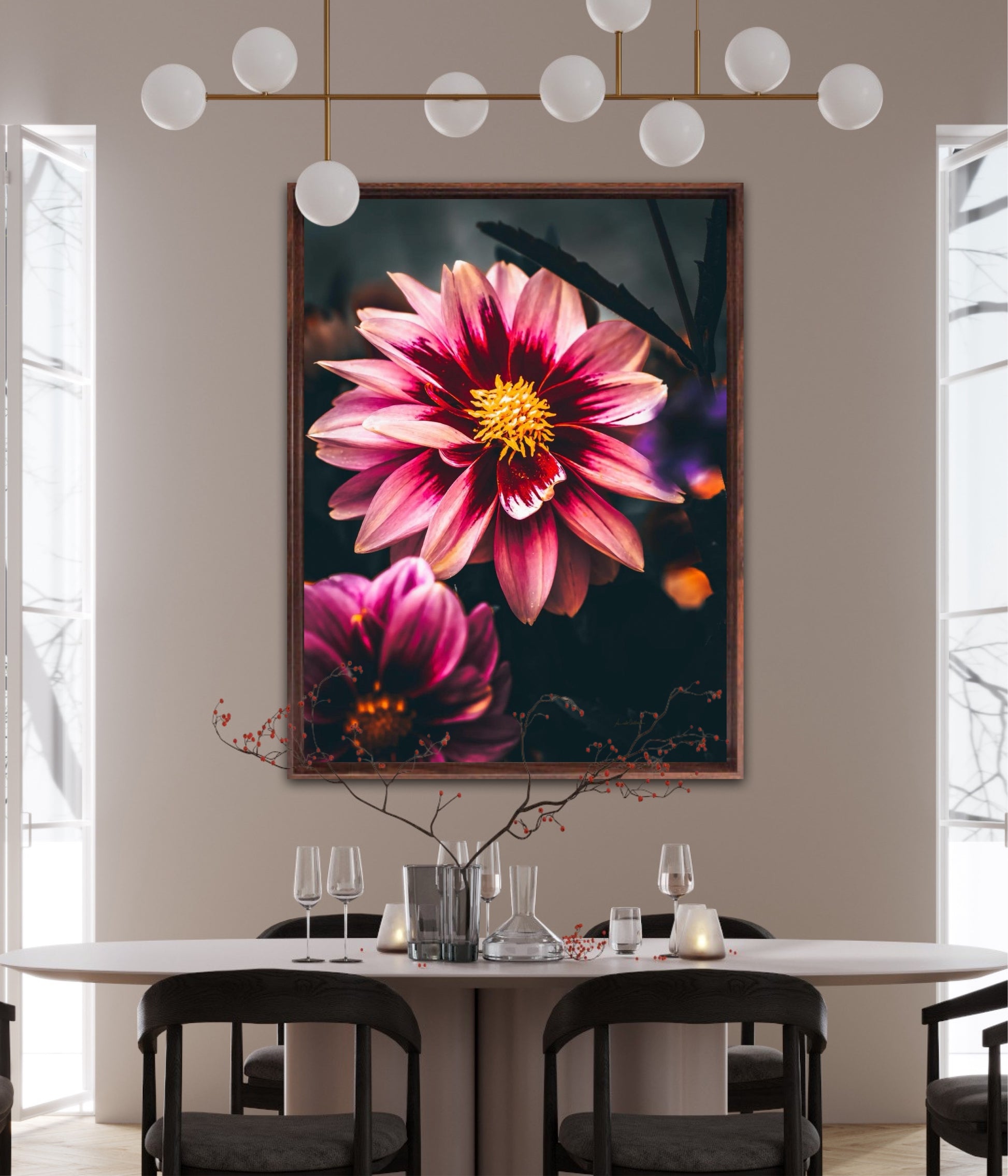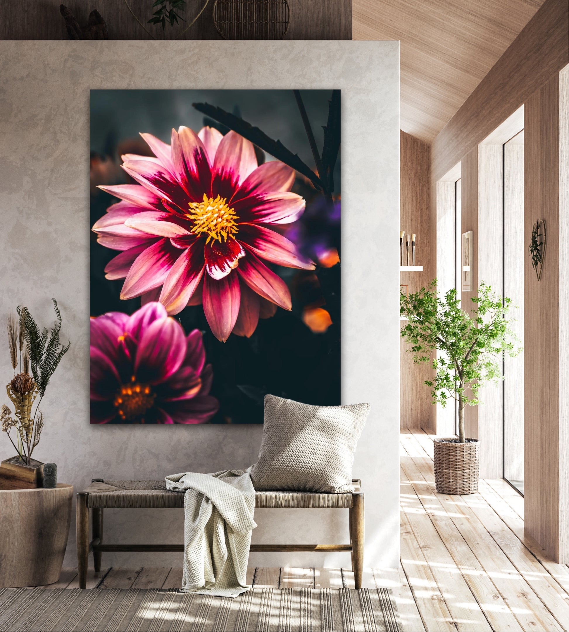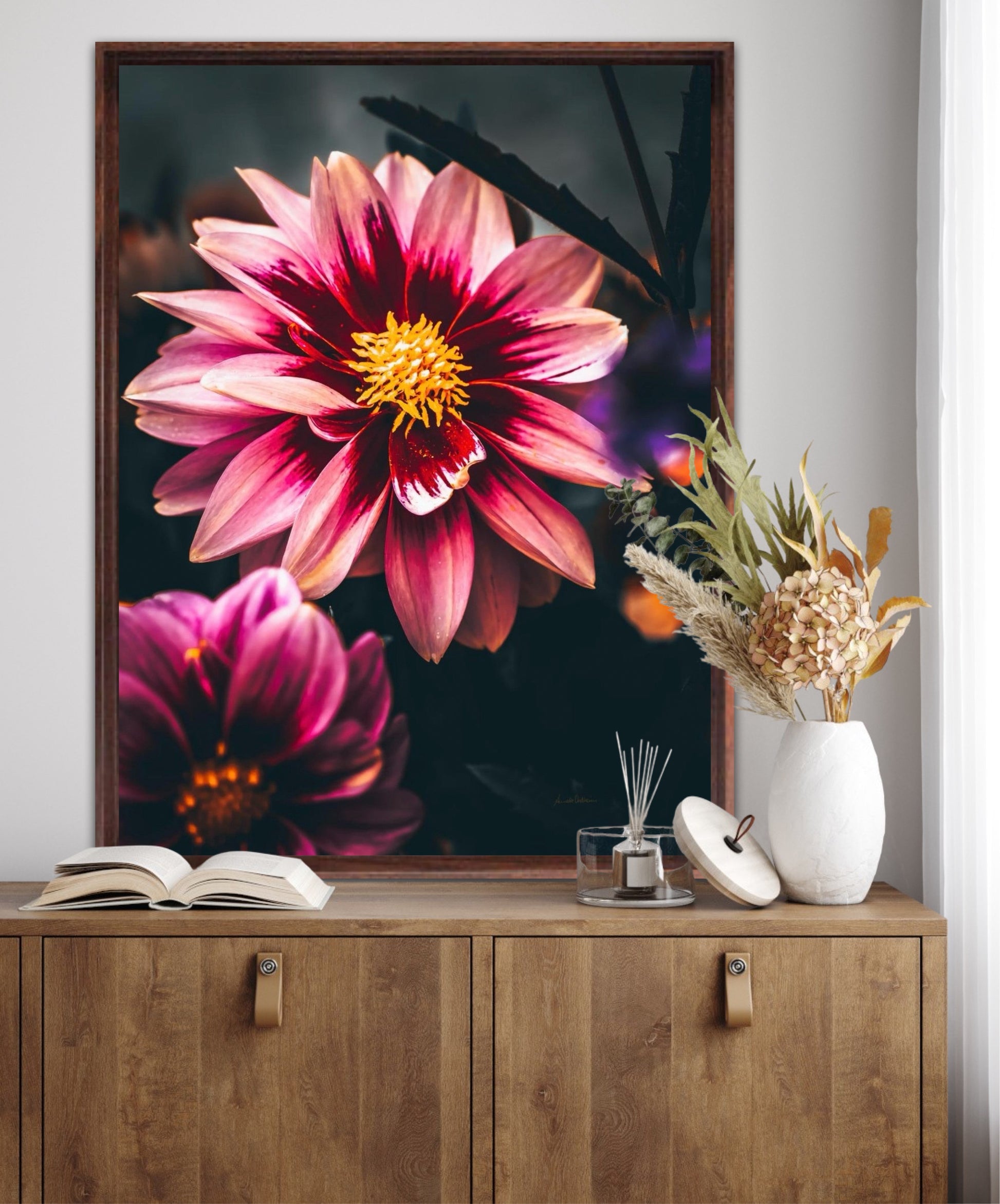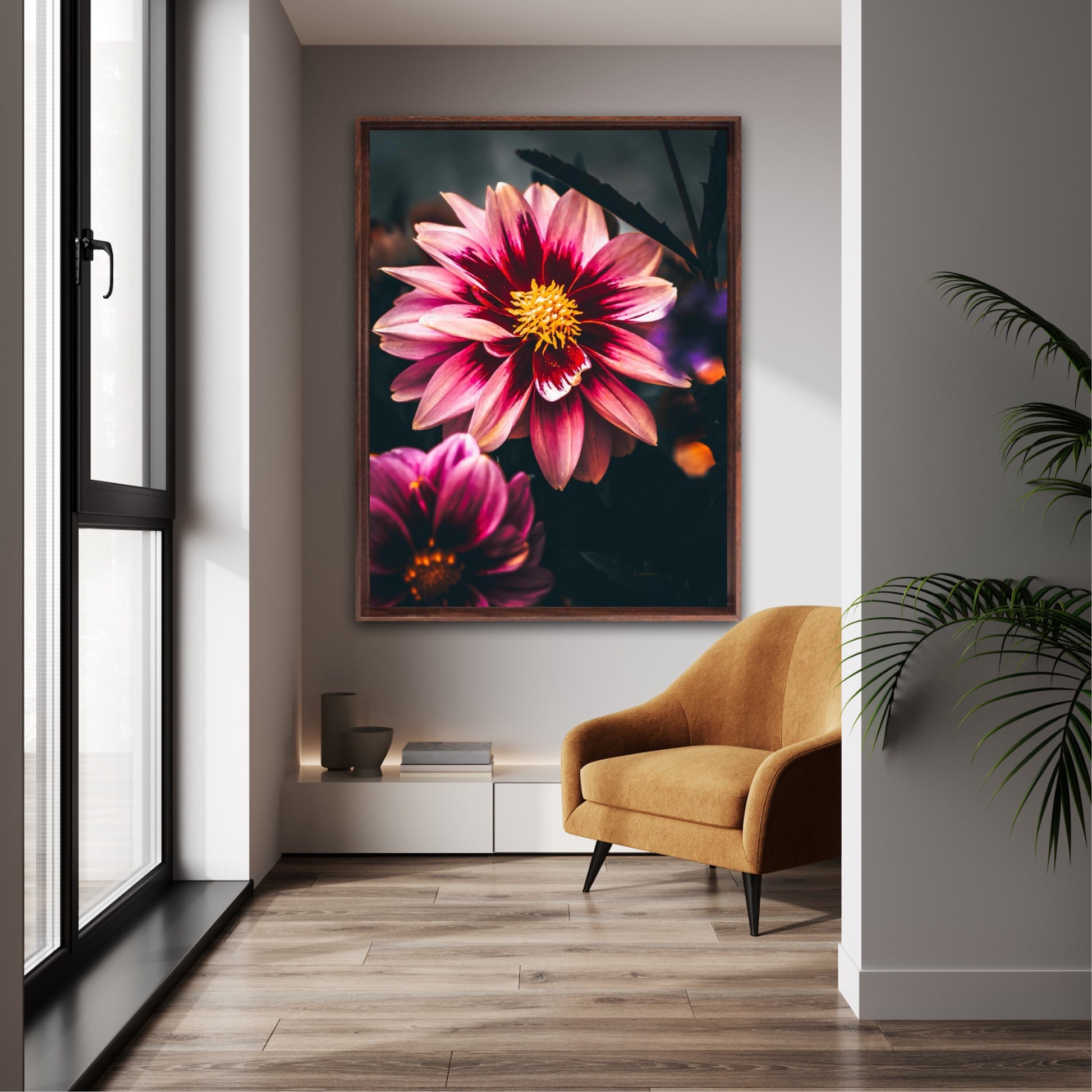 Striking photographic wall art of a Dahlia flower close up in stunning pink tones, on a dark background. This artwork will be a stand-out piece in your home and bring you peace and tranquility.
